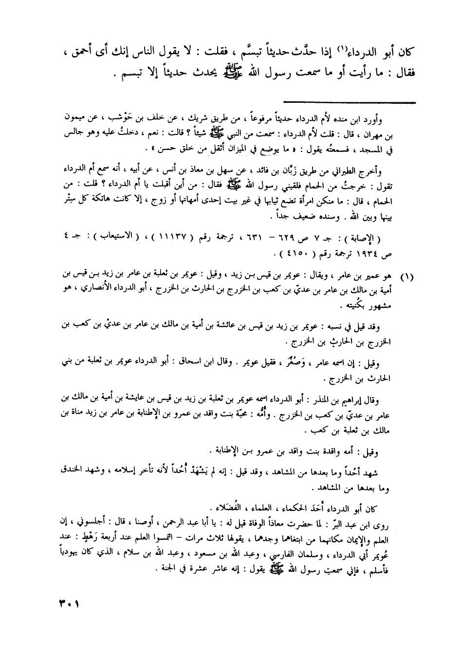 [ (1) ] هو عمير بن عامر، ويقال: عويمر بن قيس بن زيد، وقيل: عويمر بن ثعلبة بن عامر بن زيد بن قيس بن أمية بن مالك بن عامر بن عديّ بن كعب بن الخزرج بن الحارث بن الخزرج، أبو الدرداء الأنصاري، هو مشهور بكنيته.