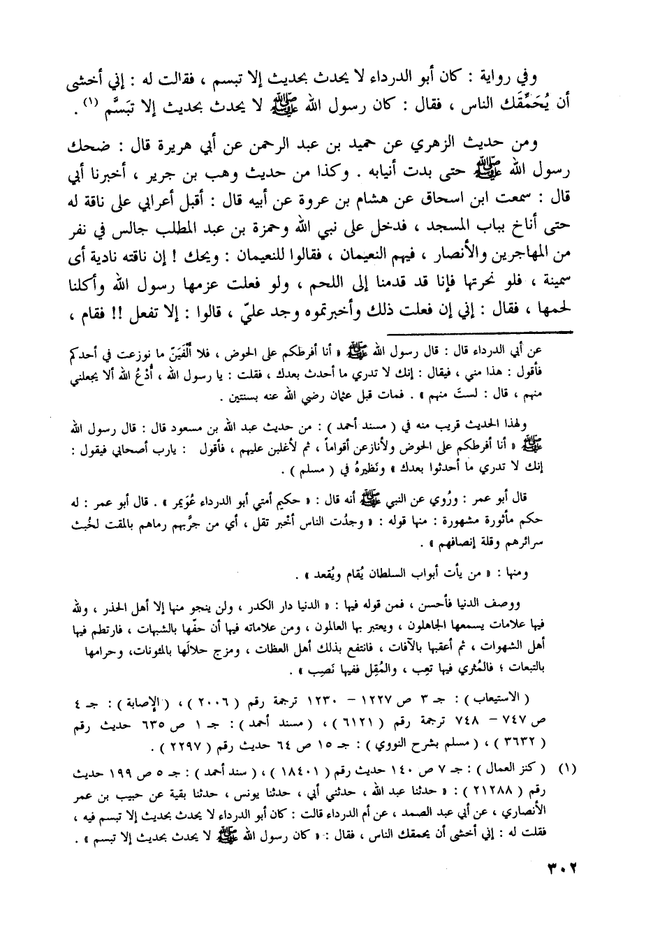 [ (1) ] (كنز العمال) : ج 7 ص 140 حديث رقم (18401) ، (سند أحمد) : ج 5 ص 199 حديث رقم (21288) : «حدثنا عبد اللَّه، حدثني أبي، حدثنا يونس، حدثنا بقية عن حبيب بن عمر الأنصاري، عن أبي عبد الصمد، عن أم الدرداء قالت: كان أبو الدرداء لا يحدث بحديث إلا تبسم فيه، فقلت له: إني أخشى أن يحمقك الناس، فقال: «كان رسول اللَّه صلّى اللَّه عليه وسلّم لا يحدث بحديث إلا تبسم» .