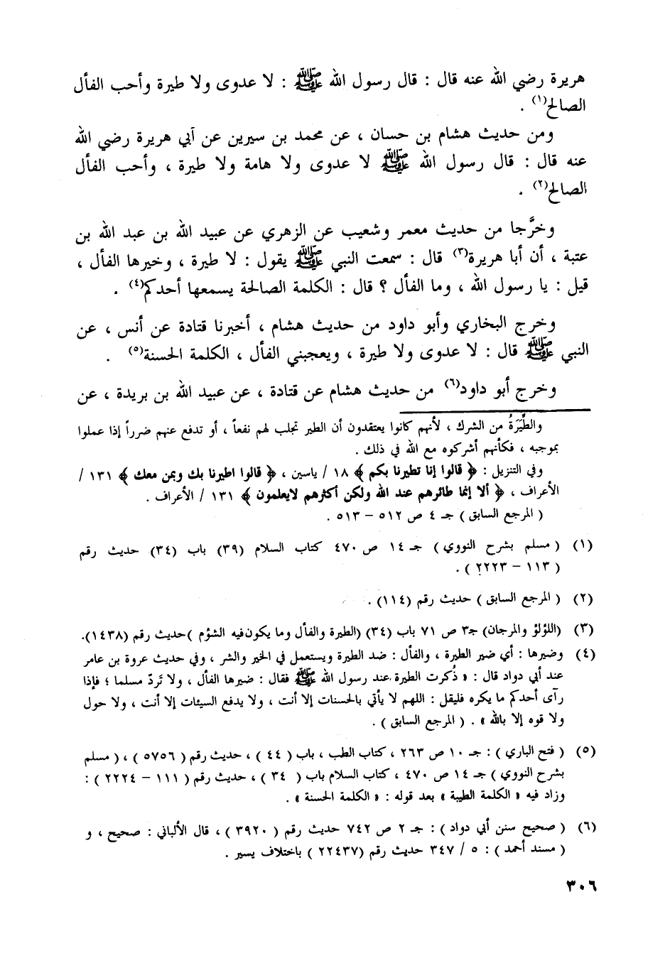 وخرج البخاري وأبو داود من حديث هشام، أخبرنا قتادة عن أنس، عن النبي صلّى اللَّه عليه وسلّم قال: لا عدوى ولا طيرة، ويعجبني الفأل، الكلمة الحسنة [ (5) ] .