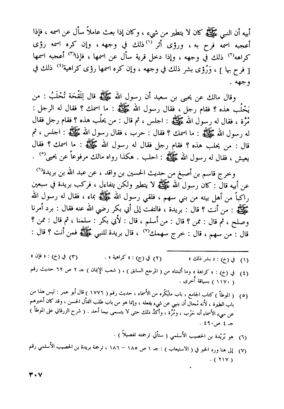 [ (5) ] (الموطأ) كتاب الجامع، باب ما يكره من الأسماء، حديث رقم (1776) قال أبو عمر: ليس هذا من باب الطيرة، لأنه محال أن ينهي عن شيء يفعله، وإنما هو من باب طلب الفأل الحسن، وقد كان أخبرهم عن سيّئ الأسماء أنه حرب، ومرّة، وأكّد ذلك حتى لا يتسمى بهما أحد. (شرح الزرقاني على الموطأ) ج 4 ص 490.