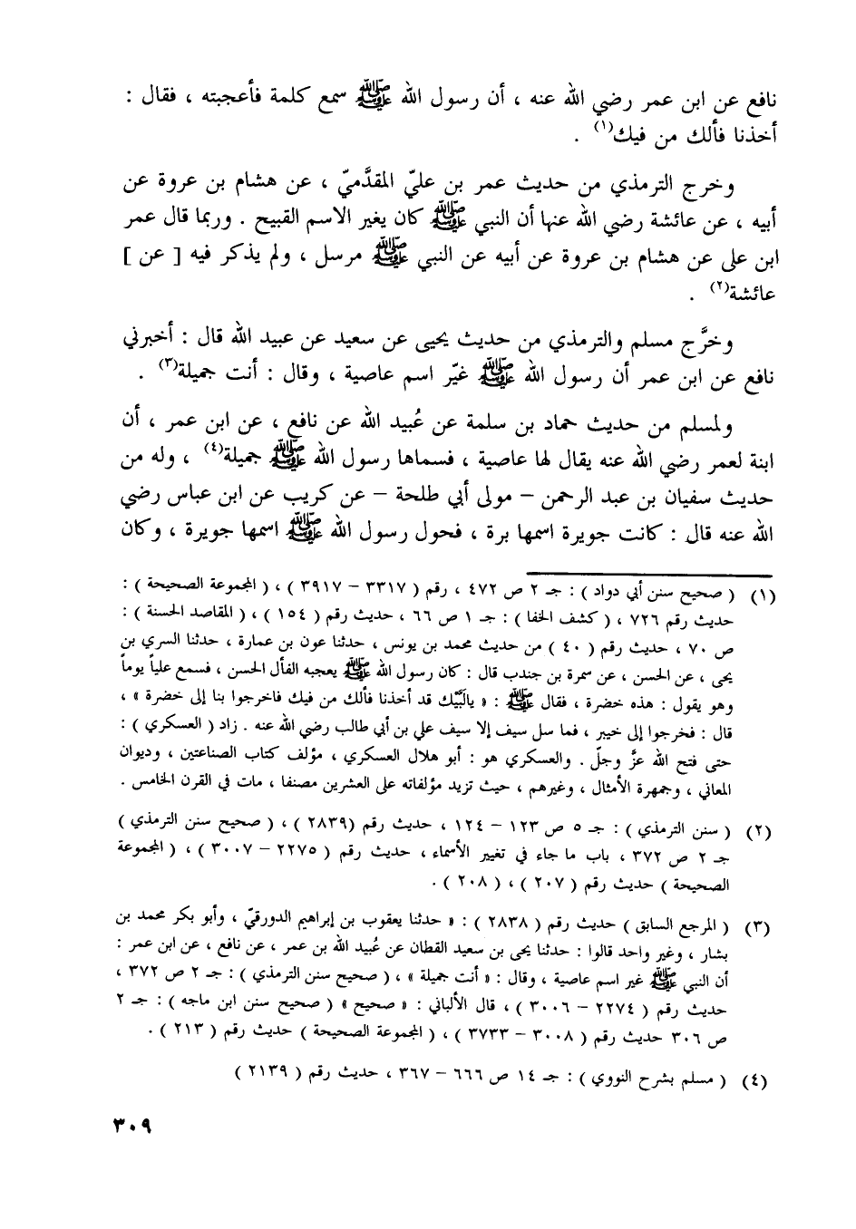 (المرجع السابق) حديث رقم (2838) : «حدثنا يعقوب بن إبراهيم الدورقيّ، وأبو بكر محمد بن بشار، وغير واحد قالوا: حدثنا يحى بن سعيد القطان عن عبيد اللَّه بن عمر، عن نافع، عن ابن عمر: أن النبي صلّى اللَّه عليه وسلّم غير اسم عاصية، وقال: «أنت جميلة» ، (صحيح سنن الترمذي) : ج 2 ص 372، حديث رقم (2274- 3006) ، قال الألباني: «صحيح» (صحيح سنن ابن ماجة) : ج 2 ص 306 حديث رقم (3008- 3733) ، (المجموعة الصحيحة) حديث رقم (213) .