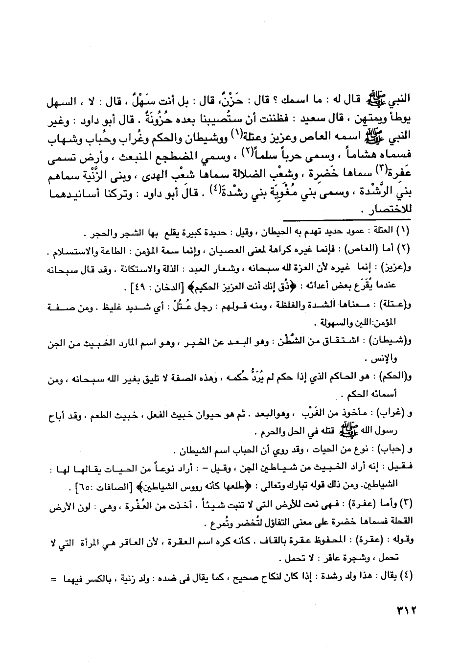 قال سعيد: فظننت أن ستصيبنا بعده حزونة. قال أبو داود: وغير النبي صلّى اللَّه عليه وسلّم اسمه العاص وعزيز وعتلة [ (1) ] ووشيطان والحكم وغراب وحباب وشهاب فسماه هشاما، وسمى حربا سلما [ (2) ] ، وسمي المضطجع المنبعث، وأرض تسمى عفرة [ (3) ] سماها خضرة، وشعب الضلالة سماها شعب الهدى، وبنى الزّنية سماهم بني الرّشدة، وسمى بني مغوية بني رشدة [ (4) ] . قال أبو داود: وتركنا أسانيدهما للاختصار.