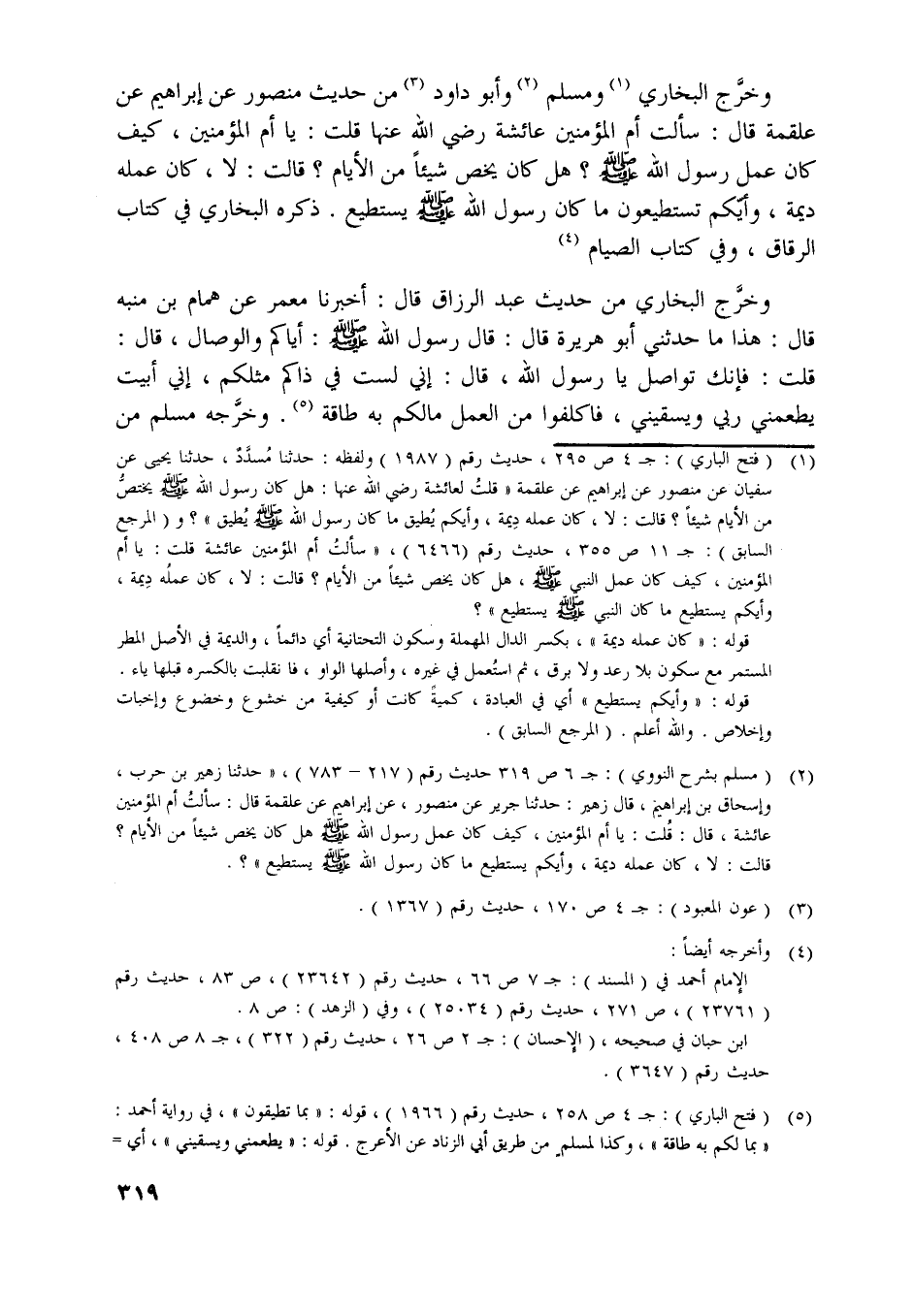 [ (1) ] (فتح الباري) : ج 4 ص 295، حديث رقم (1987) ولفظه: حدثنا مسدّد، حدثنا يحيى عن سفيان عن منصور عن إبراهيم عن علقمة «قلت لعائشة رضي اللَّه عنها: هل كان رسول اللَّه صلّى اللَّه عليه وسلّم يختصّ من الأيام شيئا؟ قالت: لا، كان عمله ديمة، وأيكم يطيق ما كان رسول اللَّه صلّى اللَّه عليه وسلّم يطيق» ؟ و (المرجع السابق) : ج 11 ص 355، حديث رقم (6466) ، «سألت أم المؤمنين عائشة قلت: يا أم المؤمنين، كيف كان عمل النبي صلّى اللَّه عليه وسلّم، هل كان يخص شيئا من الأيام؟ قالت: لا، كان عمله ديمة، وأيكم يستطيع ما كان النبي صلّى اللَّه عليه وسلّم يستطيع» ؟