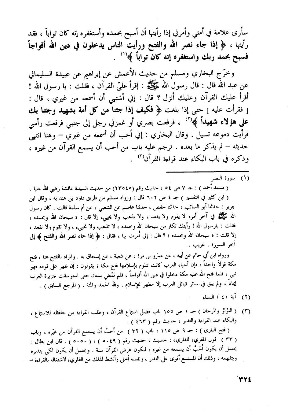 (ابن كثير في التفسير) ج 4 ص 602 قال: ورواه مسلم من طريق داود بن هند به، وقال ابن جرير: حدثنا أبو السائب، حدثنا حفص، حدثنا عاصم عن الشعبي، عن أم سلمة قالت: كان رسول اللَّه صلّى اللَّه عليه وسلّم في آخر أمره لا يقوم ولا يقعد، ولا يذهب ولا يجيئ إلا قال: «سبحان اللَّه وبحمده، فقلت: يا رسول اللَّه! رأيتك تكثر من سبحان اللَّه وبحمده، لا تذهب ولا تجئ، ولا تقوم ولا تقعد، إلا قلت: «سبحان اللَّه وبحمده» ؟ قال: إني أمرت بها، فقال: إِذا جاءَ نَصْرُ اللَّهِ وَالْفَتْحُ إلى آخر السورة. غريب.
