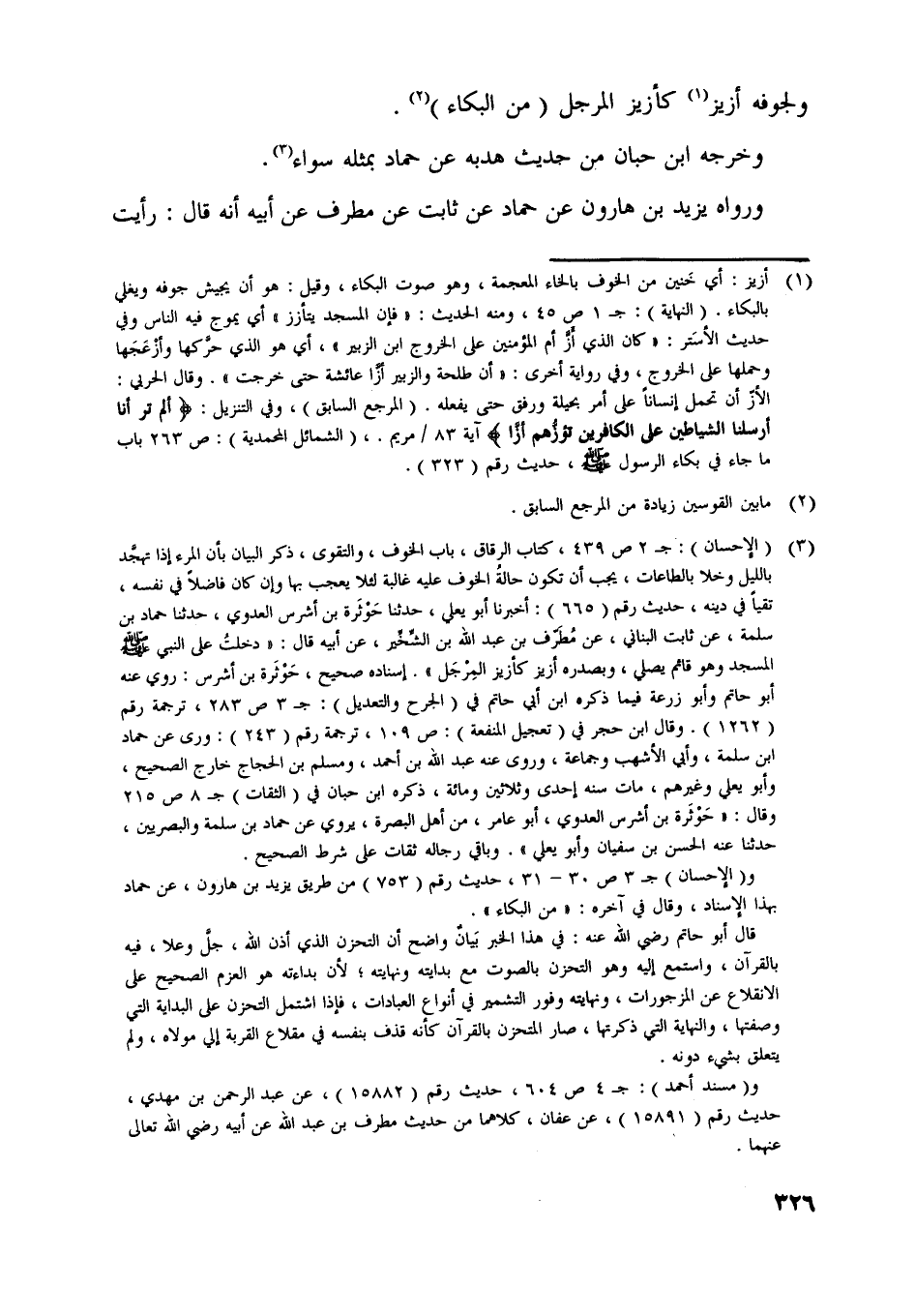 [ (3) ] (الإحسان) : ج 2 ص 439، كتاب الرقاق، باب الخوف، والتقوى، ذكر البيان بأن المرء إذا تهجّد بالليل وخلا بالطاعات، يجب أن تكون حالة الخوف عليه غالبة لئلا يعجب بها وإن كان فاضلا في نفسه، تقيا في دينه، حديث رقم (665) : أخبرنا أبو يعلي، حدثنا حوثرة بن أشرس العدوي، حدثنا حماد بن سلمة، عن ثابت البناني، عن مطرّف بن عبد اللَّه بن الشّخّير، عن أبيه قال: «دخلت على النبي صلّى اللَّه عليه وسلّم المسجد وهو قائم يصلي، وبصدره أزيز كأزيز المرجل» . إسناده صحيح، حوثرة بن أشرس: روي عنه أبو حاتم وأبو زرعة فيما ذكره ابن أبي حاتم في (الجرح والتعديل) : ج 3 ص 283، ترجمة رقم (1262) . وقال ابن حجر في (تعجيل المنفعة) : ص 109، ترجمة رقم (243) : روى عن حماد ابن سلمة، وأبي الأشهب وجماعة، وروى عنه عبد اللَّه بن أحمد، ومسلم بن الحجاج خارج الصحيح، وأبو يعلي وغيرهم، مات سنه إحدى وثلاثين ومائة، ذكره ابن حبان في (الثقات) ج 8 ص 215 وقال: «حوثرة بن أشرس العدوي، أبو عامر، من أهل البصرة، يروي عن حماد بن سلمة والبصريين، حدثنا عنه الحسن بن سفيان وأبو يعلي» . وباقي رجاله ثقات على شرط الصحيح.