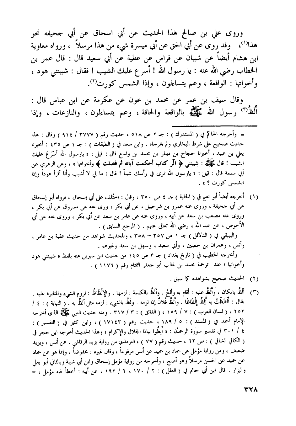 وروى علي بن صالح هذا الحديث عن أبي إسحاق عن أبي جحيفه نحو هذا [ (1) ] ، وقد روى عن أبي الحق عن أبي ميسرة شيء من هذا مرسلا، ورواه معاوية ابن هشام أيضا عن شيبان عن فراس عن عطية عن أبي سعيد قال: قال عمر بن الخطاب رضي اللَّه عنه: يا رسول اللَّه! أسرع عليك الشيب! فقال: شيبتني هود، وأخواتها: الواقعة، وعم يتساءلون، وإذا الشمس كورت [ (2) ] .