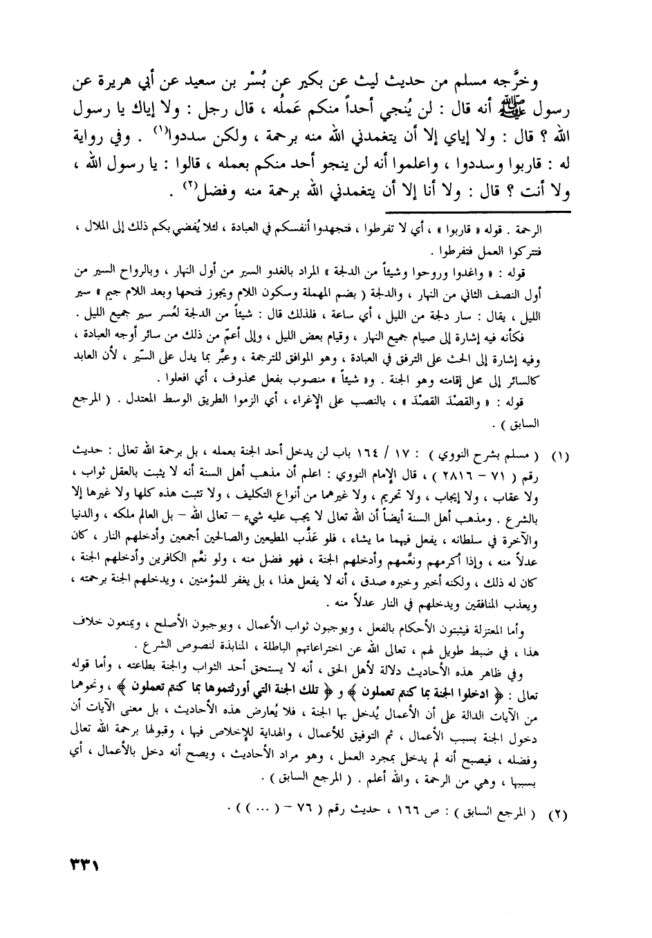 وخرّجه مسلم من حديث ليث عن بكير عن بسر بن سعيد عن أبي هريرة عن رسول اللَّه صلّى اللَّه عليه وسلّم أنه قال: لن ينجي أحدا منكم عمله، قال رجل: ولا إياك يا رسول اللَّه؟ قال: ولا إياي إلا أن يتغمدني اللَّه منه برحمة، ولكن سددوا [ (1) ] . وفي رواية له: قاربوا وسددوا، واعلموا أنه لن ينجو أحد منكم بعمله، قالوا: يا رسول اللَّه، ولا أنت؟ قال: وقال: ولا أنا إلا أن يتغمدني اللَّه برحمة منه وفضل [ (2) ] .