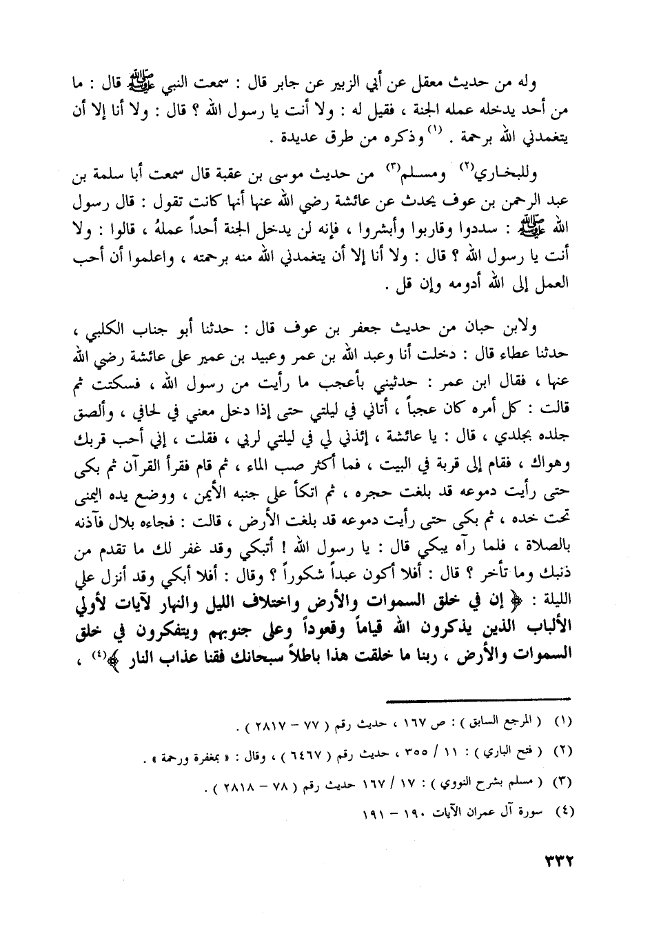 وللبخاريّ [ (2) ] ومسلم [ (3) ] من حديث موسى بن عقبة قال سمعت أبا سلمة بن عبد الرحمن بن عوف يحدث عن عائشة رضي اللَّه عنها أنها كانت تقول: قال رسول اللَّه صلّى اللَّه عليه وسلّم: سددوا وقاربوا وأبشروا، فإنه لن يدخل الجنة أحدا عمله، قالوا: ولا أنت يا رسول اللَّه؟ قال: ولا أنا إلا أن يتغمدني اللَّه منه برحمته، واعلموا أن أحب العمل إلى اللَّه أدومه وإن قل.
