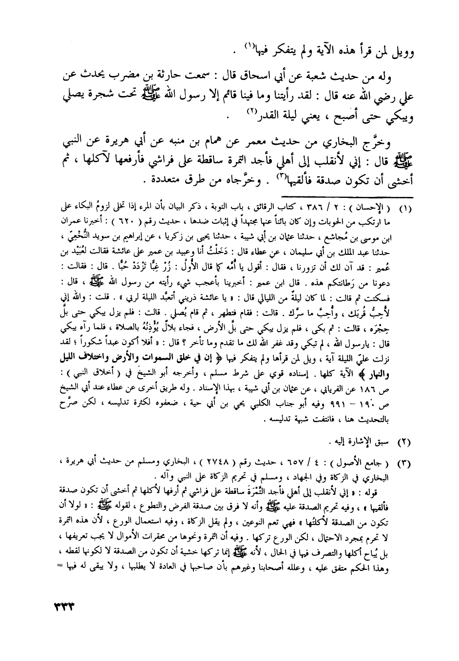 فسكتت ثم قالت: لما كان ليلة من الليالي قال: «يا عائشة ذريني أتعبّد الليلة لربي» . قلت: والله إني لأحبّ قربك، وأحبّ ما سرّك. قالت: فقام فتطهر، ثم قام يصلي. قالت: فلم يزل يبكي حتى بلّ حجره، قالت: ثم بكى، فلم يزل يبكي حتى بلّ الأرض، فجاء بلال يؤذنه بالصلاة، فلما رآه يبكي قال: يا رسول اللَّه، لم تبكي وقد غفر اللَّه لك ما تقدم وما تأخر؟ قال: «أفلا أكون عبدا شكورا، لقد نزلت عليّ الليلة آية، ويل لمن قرأها ولم يتفكر فيها إِنَّ فِي خَلْقِ السَّماواتِ وَالْأَرْضِ وَاخْتِلافِ اللَّيْلِ وَالنَّهارِ الآية كلها. إسناده قوي على شرط مسلم، وأخرجه أبو الشيخ في (أخلاق النبي) :