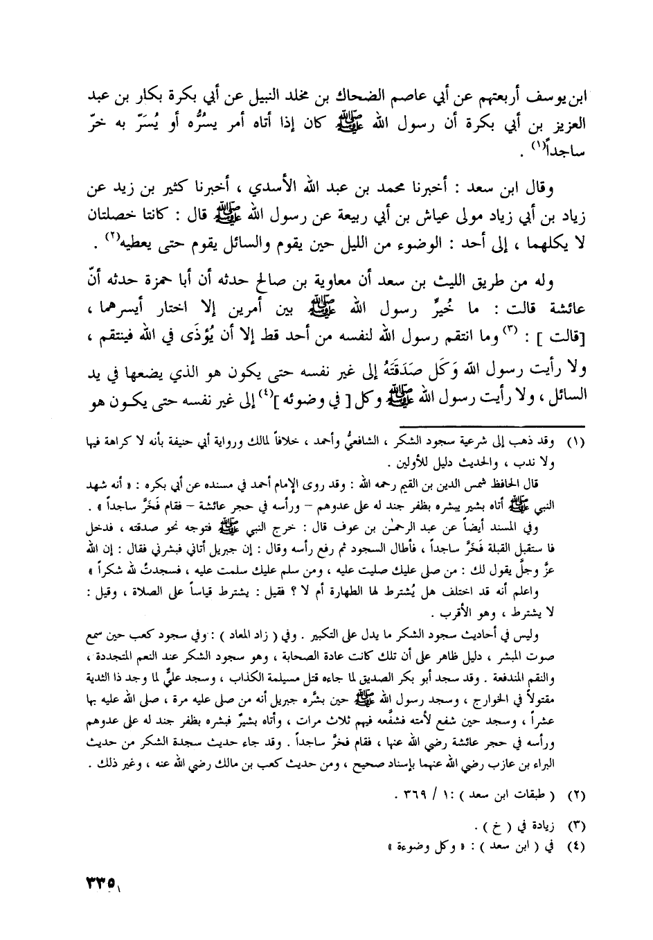 وفي المسند أيضا عن عبد الرحمن بن عوف قال: خرج النبي صلّى اللَّه عليه وسلّم فتوجه نحو صدقته، فدخل فاستقبل القبلة فخرّ ساجدا، فأطال السجود ثم رفع رأسه وقال: إن جبريل أتاني فبشرني فقال: إن اللَّه عزّ وجلّ يقول لك: من صلّى عليك صليت عليه، ومن سلم عليك سلمت عليه، فسجدت للَّه شكرا»