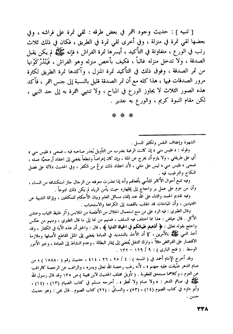 [تنبيه] : حديث وجود التمر في بعض طرقه: لقي تمرة على فراشه، وفي بعضها لقي تمرة في منزلة، وفي أخرى لقي تمرة في الطريق، فكان في ذلك ثلاث رتب في الورع، متفاوتة في التأكيد، أيسرها تمرة الفراش، فإنه صلّى اللَّه عليه وسلّم لم يكن يقبل الصدقة، ولا تدخل منزله غالبا، فكيف بأخص منزله وهو الفراش، فيندر كونها من تمر الصدقة، وفوق ذلك في التأكيد تمرة المنزل، وآكدها تمرة الطريق لكثرة مرور الصدقات فيها، هذا كله مع أن تمر الصدقة قليل بالنسبة إلى جنس التمر، فآكد هذه الصور الثلاث لا يجاوز الورع في المباح، ولا تنتهي التمرة به إلى حد النهي، لكن مقام النبوة كريم، والورع به جدير.