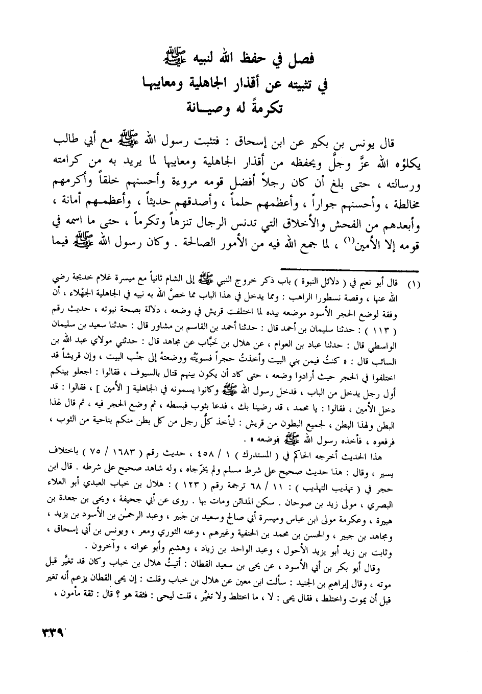 قال يونس بن بكير عن ابن إسحاق: فتثبت رسول اللَّه صلّى اللَّه عليه وسلّم مع أبي طالب يكلؤه اللَّه عزّ وجلّ ويحفظه من أقذار الجاهلية ومعايبها لما يريد به من كرامته ورسالته، حتى بلغ أن كان رجلا أفضل قومه مروءة وأحسنهم خلقا وأكرمهم مخالطة، وأحسنهم جوارا، وأعظمهم حلما، وأصدقهم حديثا، وأعظمهم أمانة، وأبعدهم من الفحش والأخلاق التي تدنس الرجال تنزها وتكرما، حتى ما اسمه في قومه إلا الأمين [ (1) ] ، لما جمع اللَّه فيه من الأمور الصالحة. وكان رسول اللَّه صلّى اللَّه عليه وسلّم فيما