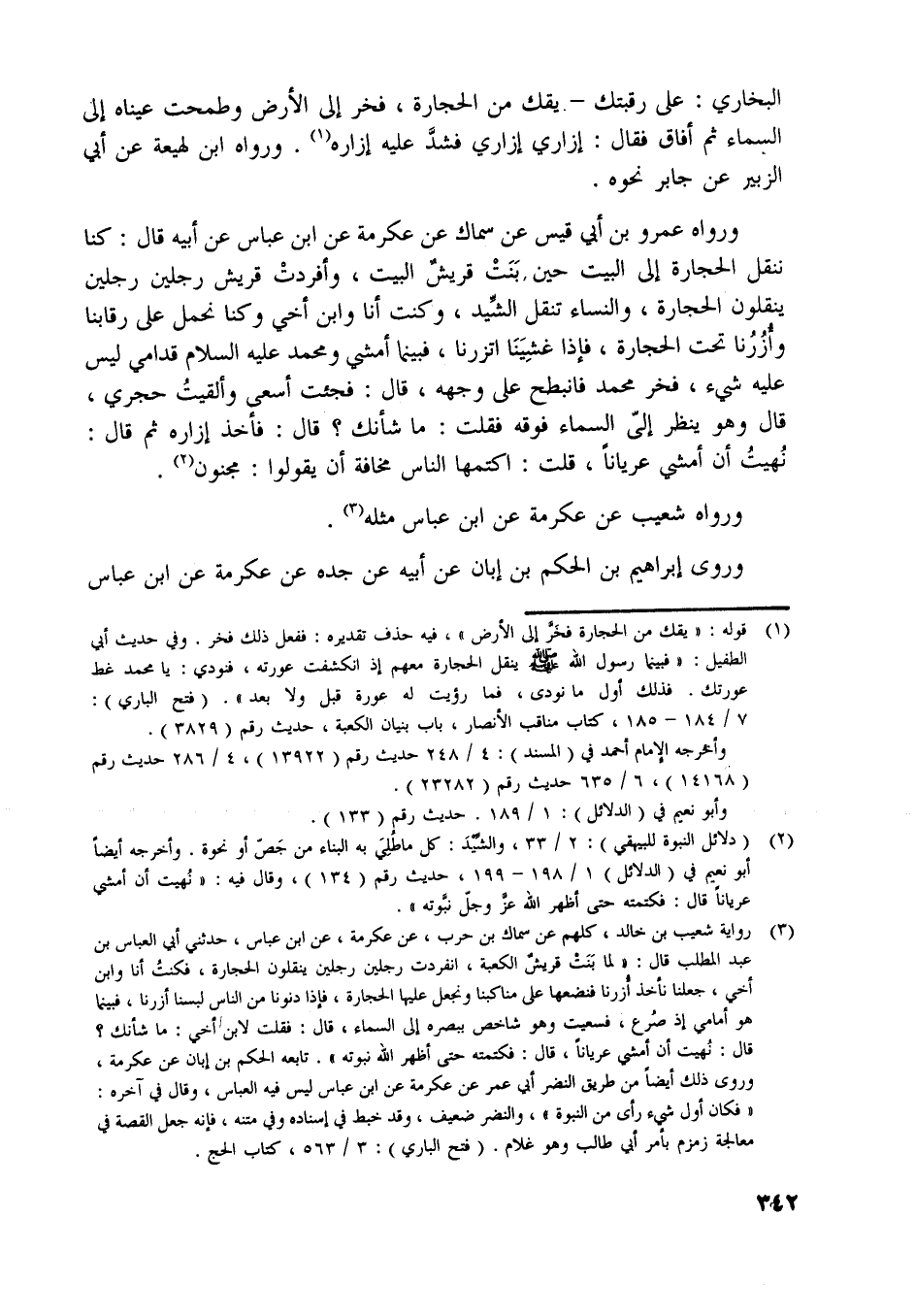 ورواه عمرو بن أبي قيس عن سماك عن عكرمة عن ابن عباس عن أبيه قال: كنا ننقل الحجارة إلى البيت حين بنت قريش البيت، وأفردت قريش رجلين رجلين ينقلون الحجارة، والنساء تنقل الشّيد، وكنت أنا وابن أخي وكنا نحمل على رقابنا وأزرنا تحت الحجارة، فإذا غشينا اتزرنا، فبينما أمشي ومحمد عليه السلام قدامي ليس عليه شيء، فخر محمد فانبطح على وجهه، قال: فجئت أسعى وألقيت حجري، قال وهو ينظر إليّ السماء فوقه فقلت: ما شأنك؟ قال: فأخذ إزاره ثم قال: