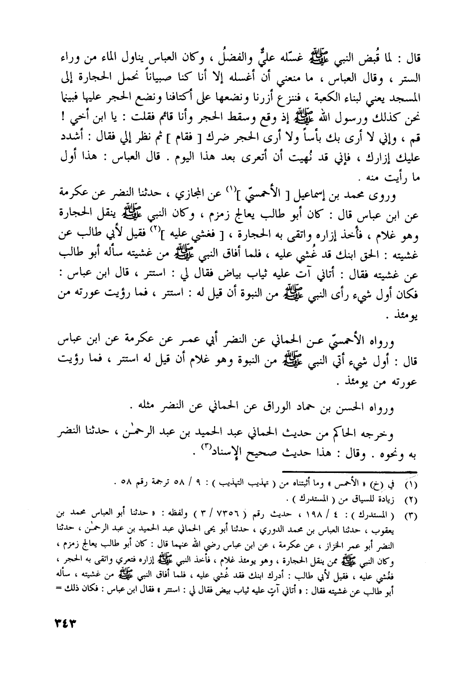 [ (3) ] (المستدرك) : 4/ 198، حديث رقم (7356/ 3) ولفظه: «حدثنا أبو العباس محمد بن يعقوب، حدثنا العباس بن محمد الدوري، حدثنا أبو يحيى الحماني عبد الحميد بن عبد الرحمن، حدثنا النضر أبو عمر الخزاز، عن عكرمة، عن ابن عباس رضي اللَّه عنهما قال: كان أبو طالب يعالج زمزم، وكان النبي صلّى اللَّه عليه وسلّم ممن ينقل الحجارة، وهو يومئذ غلام، فأخذ النبي صلّى اللَّه عليه وسلّم إزاره فتعري واتقى به الحجر، فغشي عليه، فقيل لأبي طالب: أدرك ابنك فقد غشي عليه،