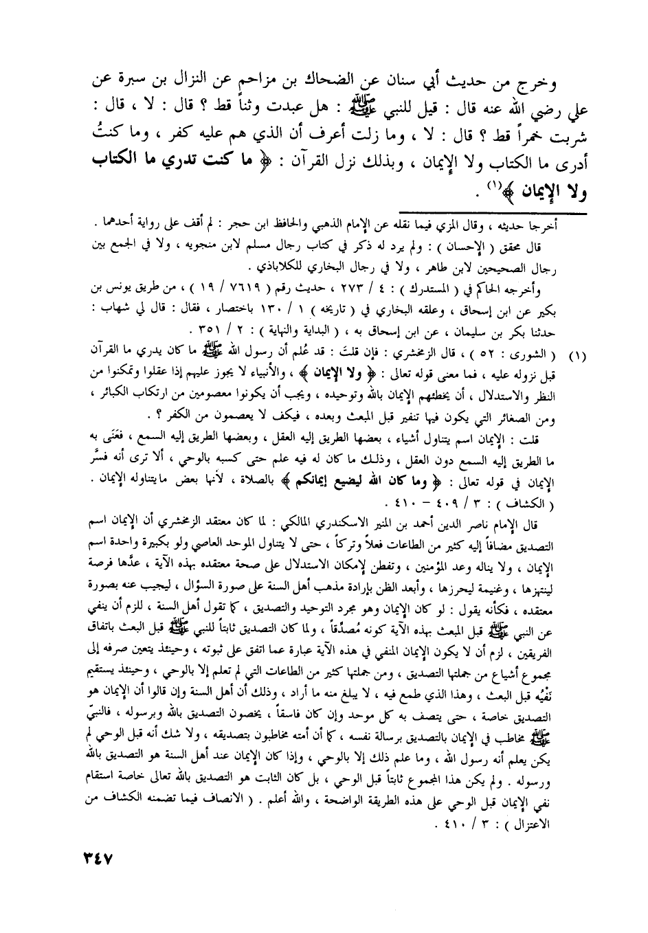 قال الإمام ناصر الدين أحمد بن المنير الاسكندري المالكي: لما كان معتقد الزمخشريّ أن الإيمان اسم التصديق مضافا إليه كثير من الطاعات فعلا وتركا، حتى لا يتناول الموحد العاصي ولو بكبيرة واحدة اسم الإيمان، ولا يناله وعد المؤمنين، وتفطن لإمكان الاستدلال على صحة معتقده بهذه الآية، عدّها فرصة لينتهزها، وغنيمة ليحرزها، وأبعد الظن بإرادة مذهب أهل السنة على صورة السؤال، ليجيب عنه بصورة معتقده، فكأنه يقول: لو كان الإيمان وهو مجرد التوحيد والتصديق، كما تقول أهل السنة، للزم أن ينفي عن النبي صلّى اللَّه عليه وسلّم قبل المبعث بهذه الآية كونه مصدّقا، ولما كان التصديق ثابتا للنّبيّ صلّى اللَّه عليه وسلّم قبل البعث باتفاق الفريقين، لزم أن لا يكون الإيمان المنفي في هذه الآية عبارة عما اتفق على ثبوته، وحينئذ يتعين صرفه إلى مجموع أشياع من جملتها التصديق، ومن جملتها كثير من الطاعات التي لم تعلم إلا بالوحي، وحينئذ يستقيم نفيه قبل البعث، وهذا الّذي طمع فيه، لا يبلغ منه ما أراد، وذلك أن أهل السنة وإن قالوا أن الإيمان هو التصديق خاصة، حتى يتصف به كل موحد وإن كان فاسقا، يخصون التصديق باللَّه وبرسوله، فالنبيّ صلّى اللَّه عليه وسلّم مخاطب في الإيمان بالتصديق برسالة نفسه، كما أن أمته مخاطبون بتصديقه، ولا شك أنه قبل الوحي لم يكن يعلم أنه رسول اللَّه، وما علم ذلك إلا بالوحي، وإذا كان الإيمان عند أهل السنة هو التصديق باللَّه ورسوله. ولم يكن هذا المجموع ثابتا قبل الوحي، بل كان الثابت هو التصديق باللَّه تعالى خاصة استقام نفي الإيمان قبل الوحي على هذه الطريقة الواضحة، واللَّه أعلم. (الإنصاف فيما تضمنه الكشاف من الاعتزال) : 3/ 410.