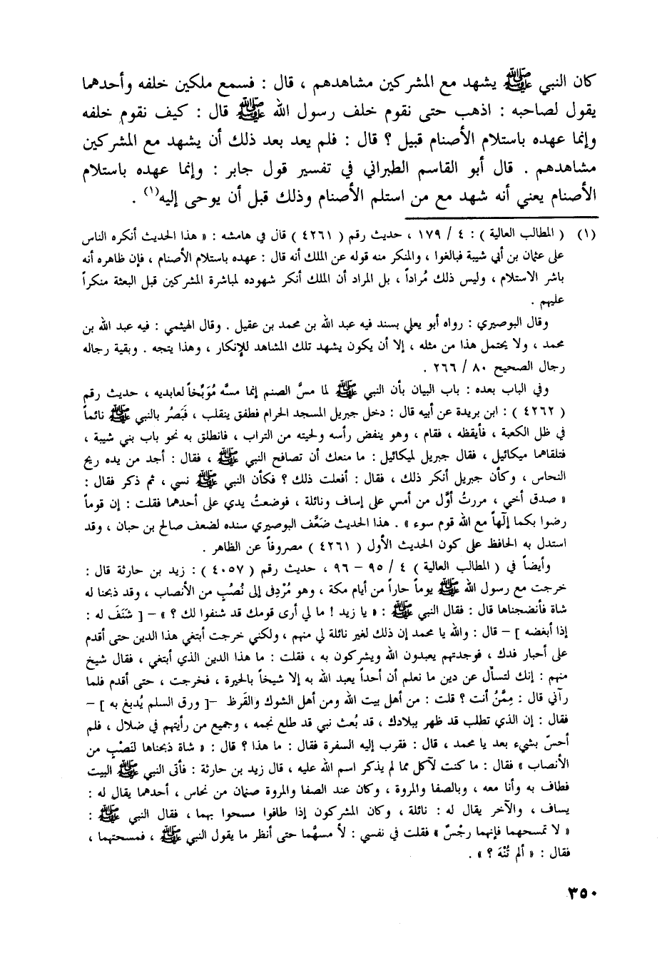 [ (1) ] (المطالب العالية) : 4/ 179، حديث رقم (4261) قال في هامشه: «هذا الحديث أنكره الناس على عثمان بن أبي شيبة فبالغوا، والمنكر منه قوله عن الملك أنه قال: عهده باستلام الأصنام، فإن ظاهره أنه باشر الاستلام، وليس ذلك مرادا، بل المراد أن الملك أنكر شهوده لمباشرة المشركين قبل البعثة منكرا عليهم.