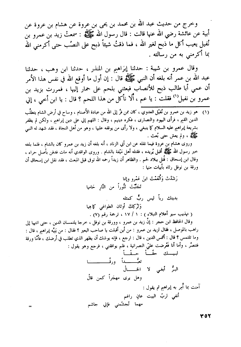 وخرج من حديث عبد اللَّه بن محمد بن يحيى بن عروة عن هشام بن عروة عن أبيه عن عائشة رضي اللَّه عنها قالت: قال رسول اللَّه صلّى اللَّه عليه وسلّم: سمعت زيد بن عمرو بن نفيل يعيب أكل ما ذبح لغير اللَّه، فما ذقت شيئا ذبح على النصب حتى أكرمني اللَّه بما أكرمني به من رسالته.