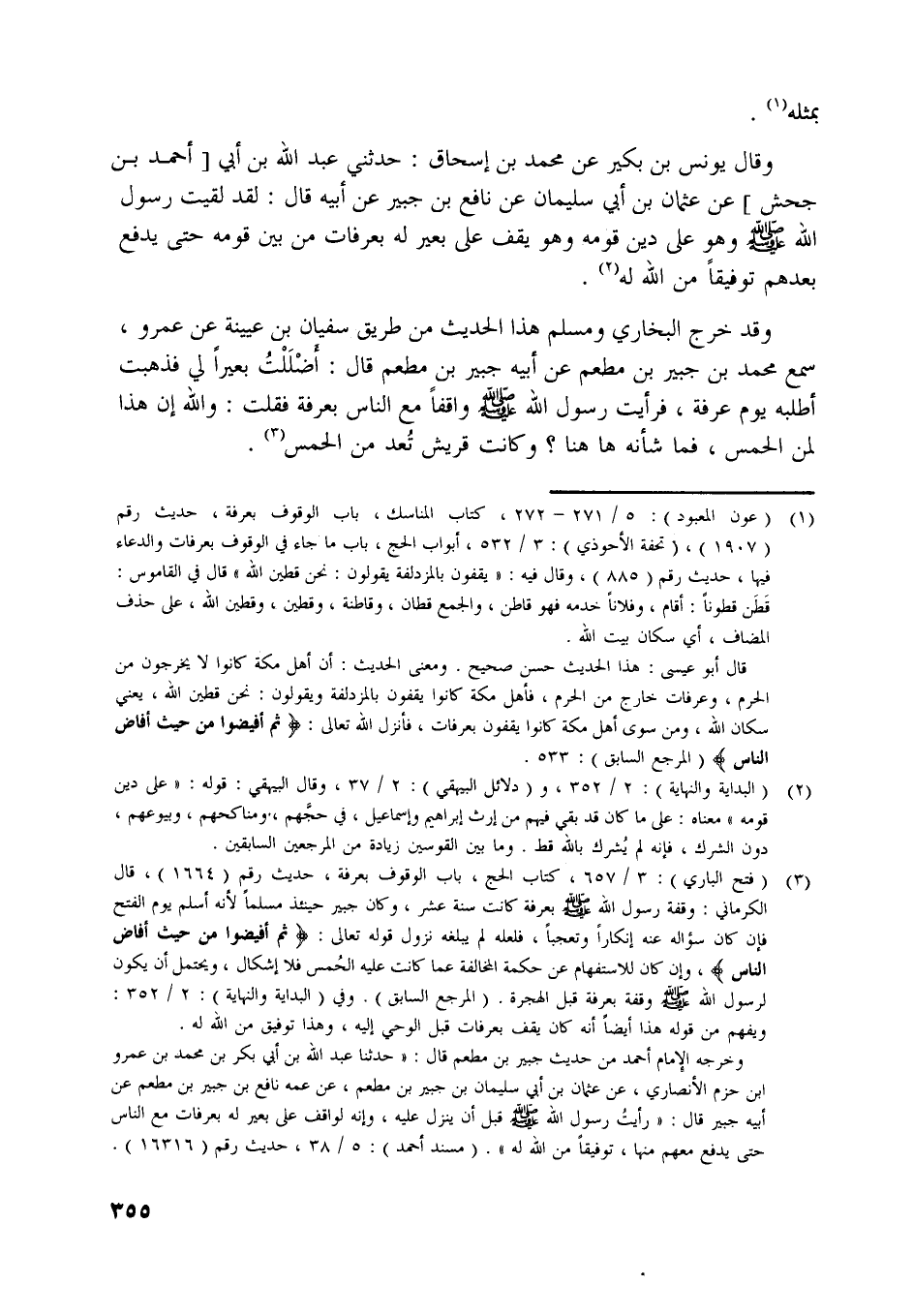 وخرجه الإمام أحمد من حديث جبير بن مطعم قال: «حدثنا عبد اللَّه بن أبي بكر بن محمد بن عمرو ابن حزم الأنصاري، عن عثمان بن أبي سليمان بن جبير بن مطعم، عن عمه نافع بن جبير بن مطعم عن أبيه جبير قال: «رأيت رسول اللَّه صلّى اللَّه عليه وسلّم قبل أن ينزل عليه، وإنه لواقف على بعير له بعرفات مع الناس حتى يدفع معهم منها، توفيقا من اللَّه له» . (مسند أحمد) : 5/ 38، حديث رقم (16316) .