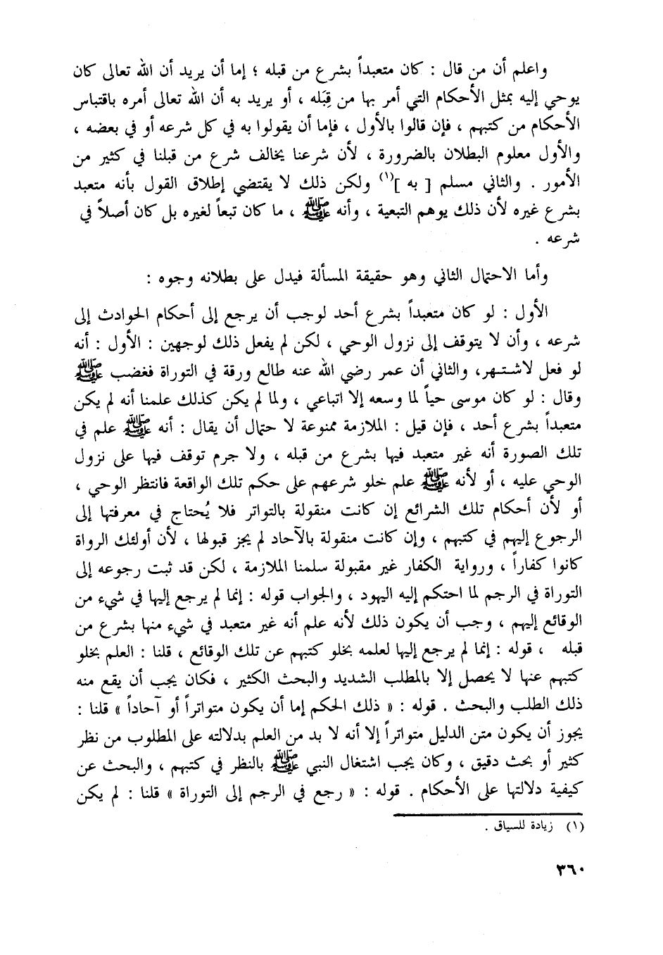 واعلم أن من قال: كان متعبدا بشرع من قبله، إما أن يريد أن اللَّه تعالى كان يوحي إليه بمثل الأحكام التي أمر بها من قبله، أو يريد به أن اللَّه تعالى أمره باقتباس الأحكام من كتبهم، فإن قالوا بالأول، فإما أن يقولوا به في كل شرعه أو في بعضه، والأول معلوم البطلان بالضرورة، لأن شرعنا يخالف شرع من قبلنا في كثير من الأمور. والثاني مسلم [به] [ (1) ] ولكن ذلك لا يقتضي إطلاق القول بأنه متعبد بشرع غيره لأن ذلك يوهم التبعية، وأنه صلّى اللَّه عليه وسلّم، ما كان تبعا لغيره بل كان أصلا في شرعه.