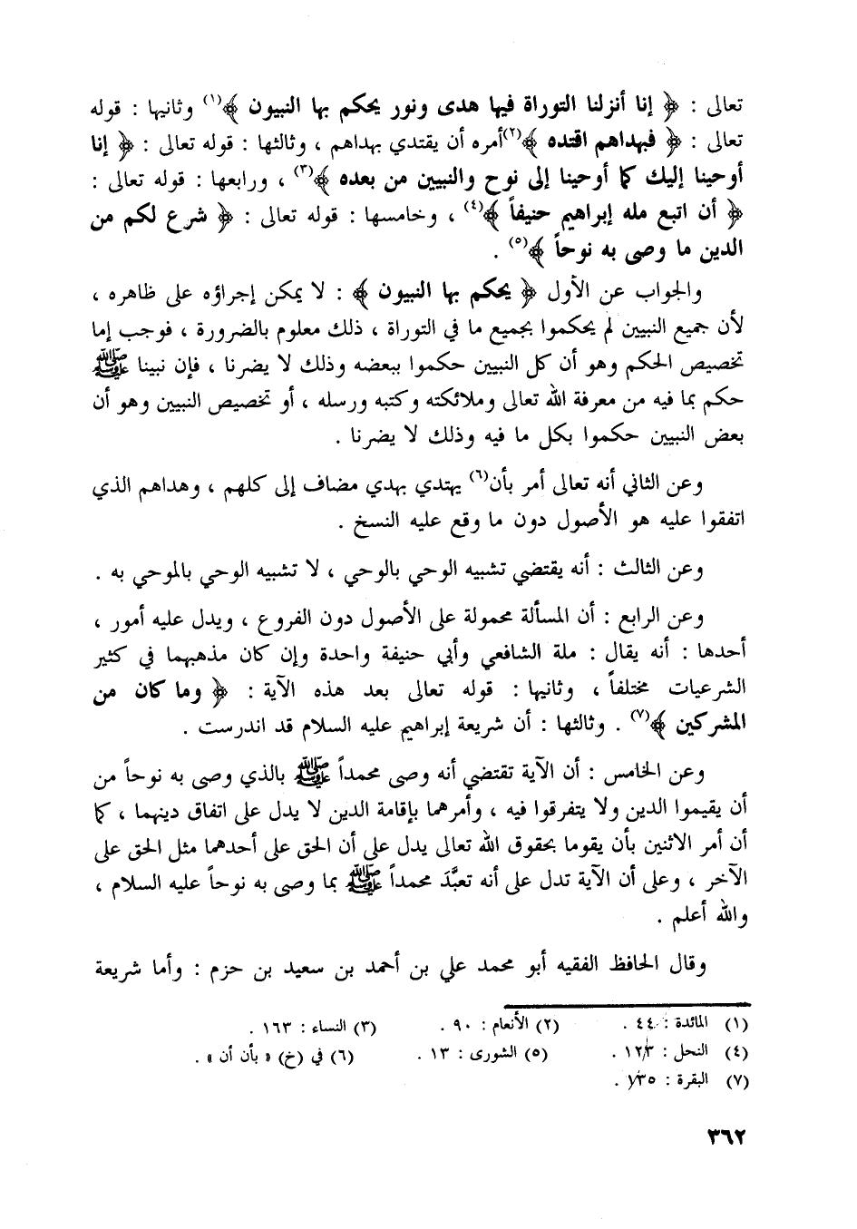 أَنِ اتَّبِعْ مِلَّةَ إِبْراهِيمَ حَنِيفاً [ (4) ] ، وخامسها: قوله تعالى: شَرَعَ لَكُمْ مِنَ الدِّينِ ما وَصَّى بِهِ نُوحاً [ (5) ] .