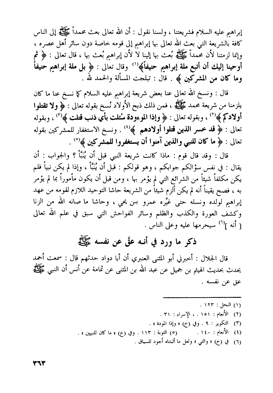 إبراهيم عليه السلام فشريعتنا، ولسنا نقول: أن اللَّه تعالى بعث محمدا صلّى اللَّه عليه وسلّم إلى الناس كافة بالشريعة التي بعث اللَّه تعالى بها إبراهيم إلى قومه خاصة دون سائر أهل عصره، وإنما لزمتنا لأن محمدا صلّى اللَّه عليه وسلّم بعث بها إلينا لا لأن إبراهيم بعث بها، قال تعالى: ثُمَّ أَوْحَيْنا إِلَيْكَ أَنِ اتَّبِعْ مِلَّةَ إِبْراهِيمَ حَنِيفاً [ (1) ] وقال تعالى: بَلْ مِلَّةَ إِبْراهِيمَ حَنِيفاً وَما كانَ مِنَ الْمُشْرِكِينَ. قال: تبلجت المسألة والحمد للَّه.