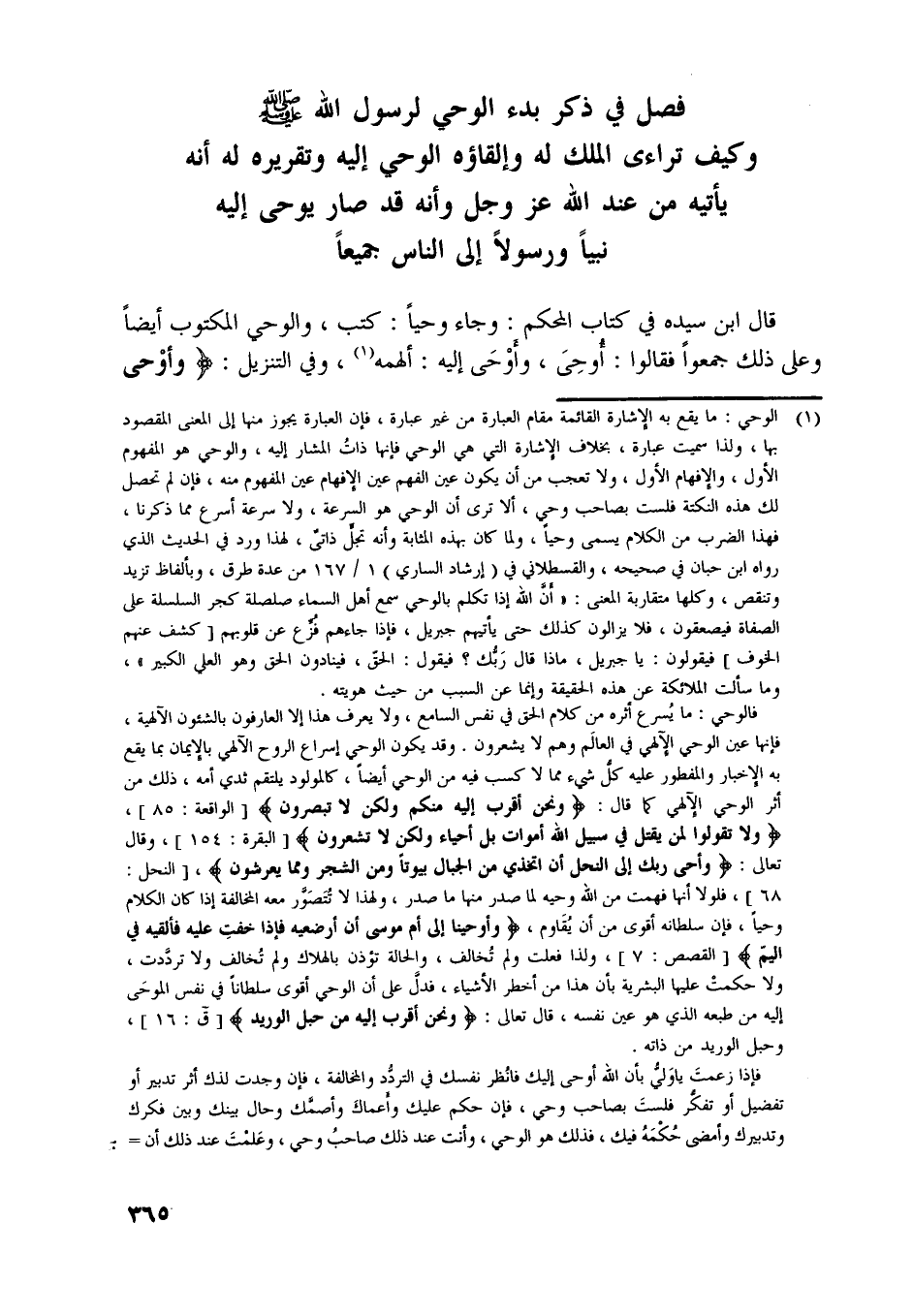 [ (1) ] الوحي: ما يقع به الإشارة القائمة مقام العبارة من غير عبارة، فإن العبارة يجوز منها إلى المعنى المقصود بها، ولذا سميت عبارة، بخلاف الإشارة التي هي الوحي فإنّها ذات المشار إليه، والوحي هو المفهوم الأول، والإفهام الأول، ولا تعجب من أن يكون عين الفهم عين الإفهام عين المفهوم منه، فإن لم تحصل لك هذه النكتة فلست بصاحب وحي، ألا ترى أن الوحي هو السرعة، ولا سرعة أسرع مما ذكرنا، فهذا الضرب من الكلام يسمى وحيا، ولما كان بهذه المثابة وأنه تجلّ ذاتي، لهذا ورد في الحديث الّذي رواه ابن حبان في صحيحه، والقسطلاني في (إرشاد الساري) 1/ 167 من عدة طرق، وبألفاظ تزيد وتنقص، وكلها متقاربة المعنى: «أنّ اللَّه إذا تكلم بالوحي سمع أهل السماء صلصلة كجر السلسلة على الصفاة فيصعقون، فلا يزالون كذلك حتى يأتيهم جبريل، فإذا جاءهم فزّع عن قلوبهم [كشف عنهم الخوف] فيقولون: يا جبريل، ماذا قال ربّك؟ فيقول: الحقّ، فينادون الحق وهو العلي الكبير» ، وما سألت الملائكة عن هذه الحقيقة وإنما عن السبب من حيث هويته.