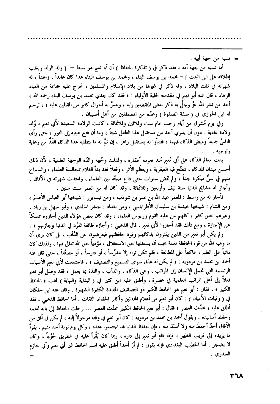 أما نسبه من جهة أمه، فقد ذكر في (تذكرة الحفاظ) أن أبا نعيم هو سبط-[ولد الولد ويغلب إطلاقه على ابن البنت]- محمد بن يوسف البناء، ومحمد بن يوسف البناء هذا كان عابدا، زاهدا، له شهرته في تلك البلاد، وله ذكر في غيرها من بلاد الإسلام والمسلمين، تخرج عليه جماعة من العباد الزهاد، قال عنه أبو نعيم في مقدمته لحلية الأولياء: «فقد كان جدي محمد بن يوسف البناء رحمه اللَّه، أحد من نشر اللَّه عزّ وجلّ به ذكر بعض المنقطعين إليه، وعمّر به أحوال كثير من المقبلين عليه» ، ترجم له ابن الجوزي في (صفة الصفوة) وعدّه من المصطفين من أهل أصبهان.