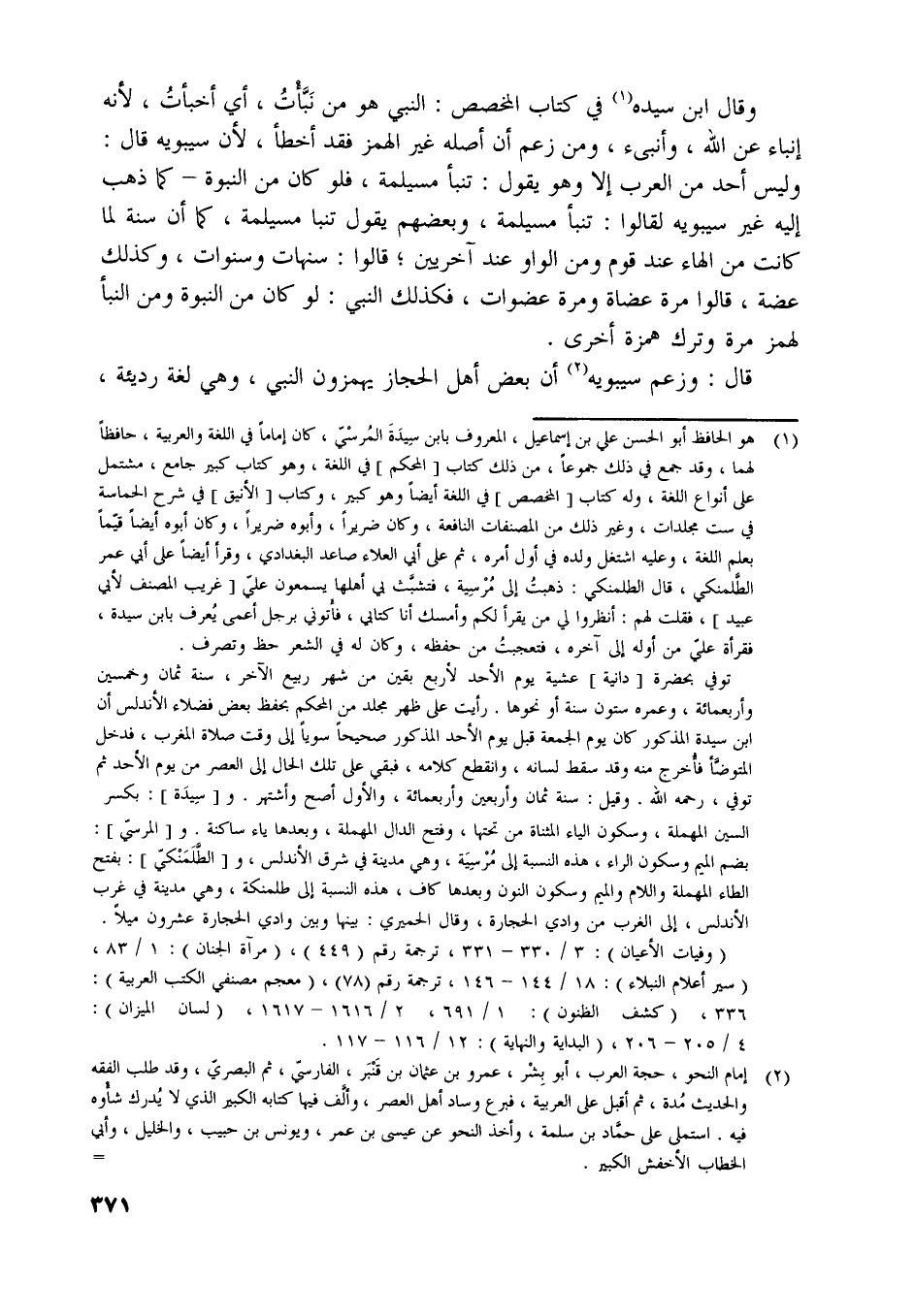 وليس أحد من العرب إلا وهو يقول: تنبأ مسيلمة، فلو كان من النبوة- كما ذهب إليه غير سيبويه لقالوا: تنبأ مسيلمة، وبعضهم يقول تنبّأ مسيلمة، كما أن سنة لما كانت من الهاء عند قوم ومن الواو عند آخريين، قالوا: سنهات وسنوات، وكذلك عضة، قالوا مرة عضاة ومرة عضوات، فكذلك النبي: لو كان من النبوة ومن النبأ لهمز مرة وترك همزة أخرى.