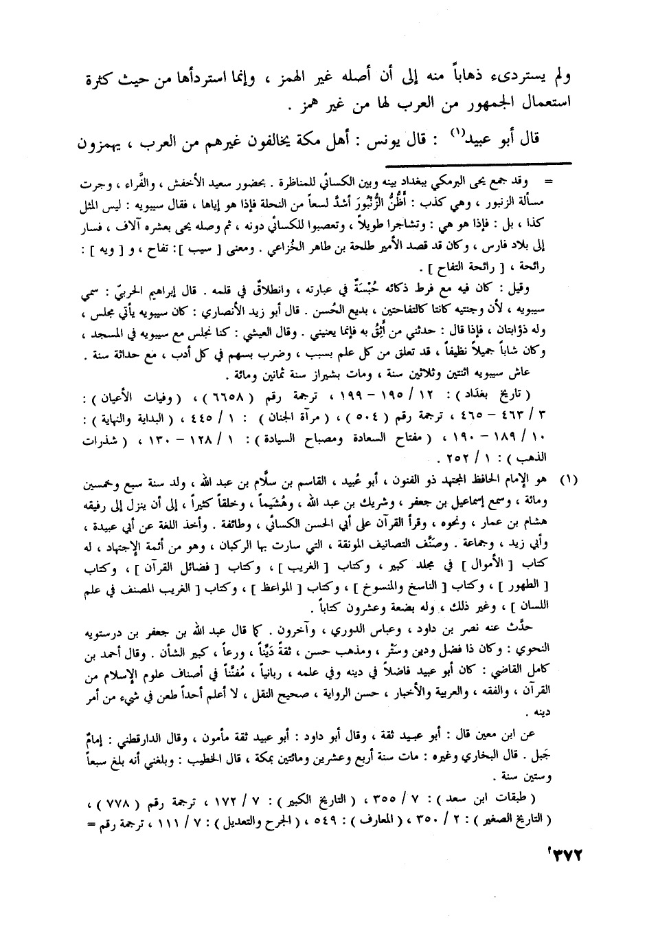 [ (1) ] هو الإمام الحافظ المجتهد ذو الفنون، أبو عبيد، القاسم بن سلّام بن عبد اللَّه، ولد سنة سبع وخمسين ومائة، وسمع إسماعيل بن جعفر، وشريك بن عبد اللَّه، وهشيما، وخلقا كثيرا، إلى أن ينزل إلى رفيقه هشام بن عمار، ونحوه، وقرأ القرآن على أبي الحسن الكسائي، وطائفة. وأخذ اللغة عن أبي عبيدة، وأبي زيد، وجماعة. وصنّف التصانيف المؤنقة، التي سارت بها الركبان، وهو من أئمة الاجتهاد، له كتاب [الأموال] في مجلد كبير، وكتاب [الغريب] ، وكتاب [فضائل القرآن] ، وكتاب [الطهور] ، وكتاب [الناسخ والمنسوخ] ، وكتاب [المواعظ] ، وكتاب [الغريب المصنف في علم اللسان] ، وغير ذلك، وله بضعة وعشرون كتابا.