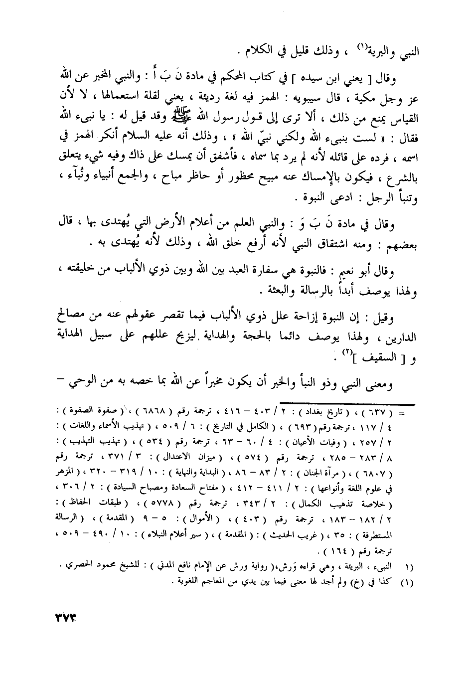 وقال [يعني ابن سيده] في كتاب المحكم في مادة ن ب أ: والنبي المخبر عن اللَّه عز وجل مكية، قال سيبويه: الهمز فيه لغة رديئة، يعني لقلة استعمالها، لا لأن القياس يمنع من ذلك، ألا ترى إلى