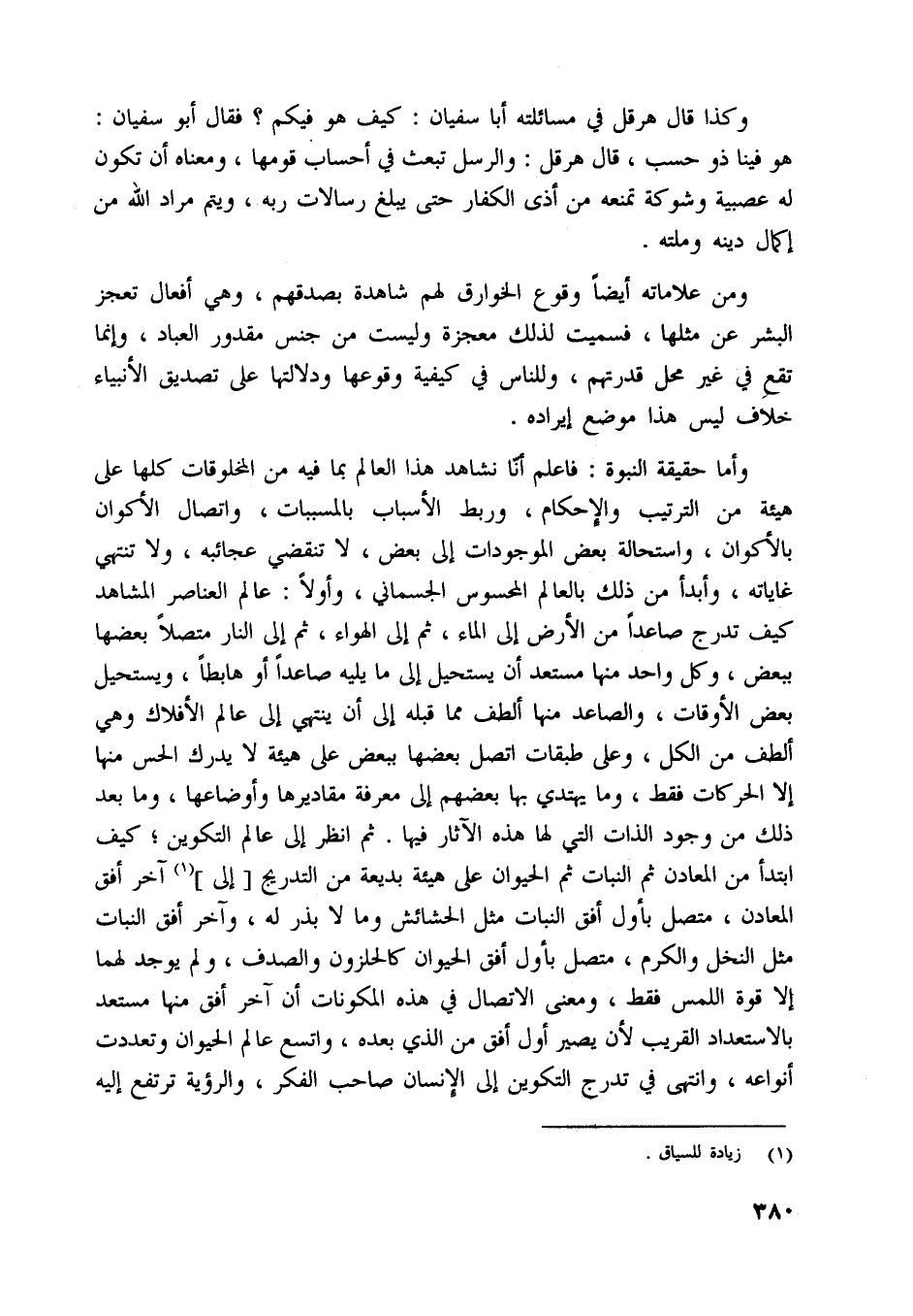 وأما حقيقة النبوة: فاعلم أنّا نشاهد هذا العالم بما فيه من المخلوقات كلها على هيئة من الترتيب والإحكام، وربط الأسباب بالمسببات، واتصال الأكوان بالأكوان، واستحالة بعض الموجودات إلى بعض، لا تنقضي عجائبه، ولا تنتهي غاياته، وأبدأ من ذلك بالعالم المحسوس الجسماني، وأولا: عالم العناصر المشاهد كيف تدرج صاعدا من الأرض إلى الماء، ثم إلى الهواء، ثم إلى النار متصلا بعضها ببعض، وكل واحد منها مستعد أن يستحيل إلى ما يليه صاعدا أو هابطا، ويستحيل بعض الأوقات، والصاعد منها ألطف مما قبله إلى أن ينتهي إلى عالم الأفلاك وهي ألطف من الكل، وعلى طبقات اتصل بعضها ببعض على هيئة لا يدرك الحس منها إلا الحركات فقط، وما يهتدي بها بعضهم إلى معرفة مقاديرها وأوضاعها، وما بعد ذلك من وجود الذات التي لها هذه الآثار فيها. ثم انظر إلى عالم التكوين، كيف ابتدأ من المعادن ثم النبات ثم الحيوان على هيئة بديعة من التدريج [إلى] [ (1) ] آخر أفق المعادن، متصل بأول أفق النبات مثل الحشائش وما لا بذر له، وآخر أفق النبات مثل النخل والكرم، متصل بأول أفق الحيوان كالحلزون والصدف، ولم يوجد لهما إلا قوة اللمس فقط، ومعنى الاتصال في هذه المكونات أن آخر أفق منها مستعد بالاستعداد القريب لأن يصير أول أفق من الّذي بعده، واتسع عالم الحيوان وتعددت أنواعه، وانتهى في تدرج التكوين إلى الإنسان صاحب الفكر، والرؤية ترتفع إليه