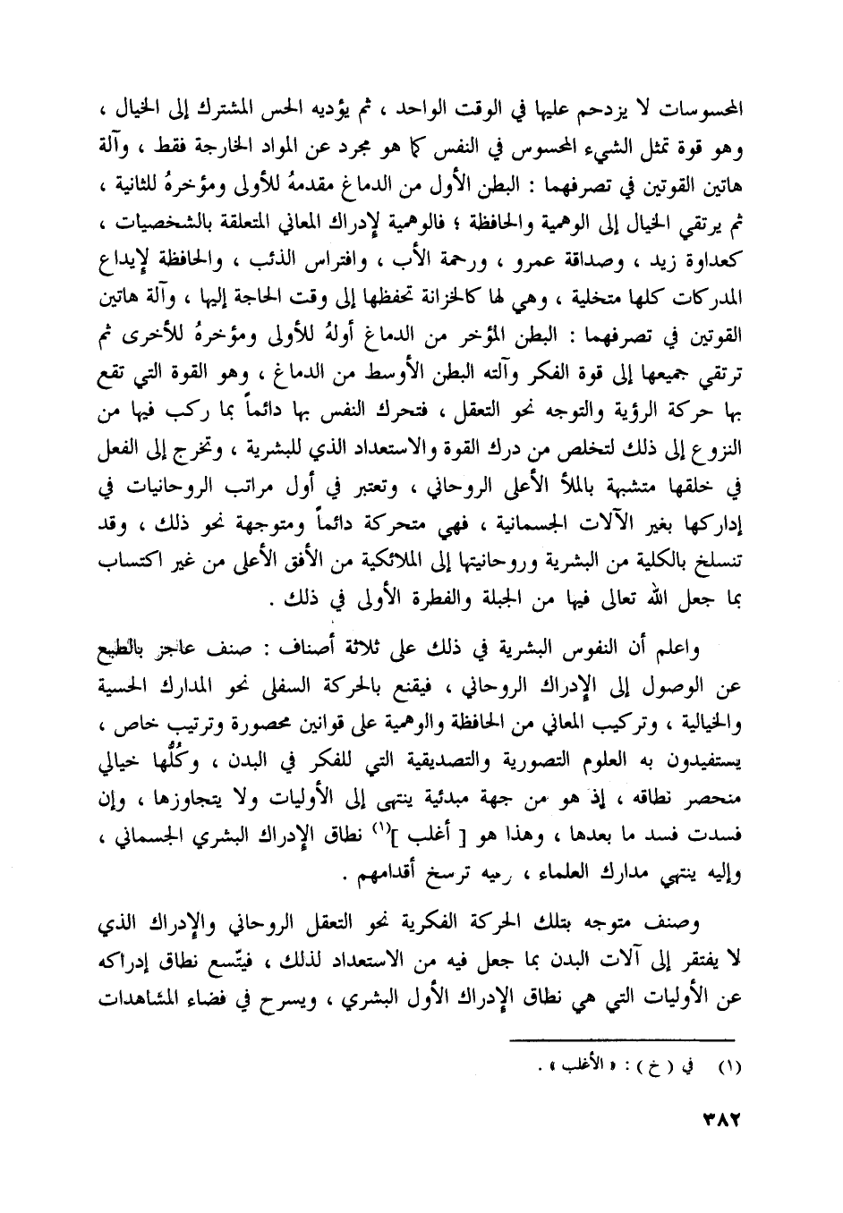 المحسوسات لا يزدحم عليها في الوقت الواحد، ثم يؤديه الحس المشترك إلى الخيال، وهو قوة تمثل الشيء المحسوس في النفس كما هو مجرد عن المواد الخارجة فقط، وآلة هاتين القوتين في تصرفهما: البطن الأول من الدماغ مقدمه للأولى ومؤخره للثانية، ثم يرتقي الخيال إلى الوهمية والحافظة، فالوهمية لإدراك المعاني المتعلقة بالشخصيات، كعداوة زيد، وصداقة عمرو، ورحمة الأب، وافتراس الذئب، والحافظة لإيداع المدركات كلها متخلية، وهي لها كالخزانة تحفظها إلى وقت الحاجة إليها، وآلة هاتين القوتين في تصرفهما: البطن المؤخر من الدماغ أوله للأولى ومؤخره للأخرى ثم ترتقي جميعها إلى قوة الفكر وآلته البطن الأوسط من الدماغ، وهو القوة التي تقع بها حركة الرؤية والتوجه نحو التعقل، فتحرك النفس بها دائما بما ركب فيها من النزوع إلى ذلك لتخلص من درك القوة والاستعداد الّذي للبشرية، وتخرج إلى الفعل في خلقها متشبهة بالملإ الأعلى الروحانيّ، وتعتبر في أول مراتب الروحانيات في إداركها بغير الآلات الجسمانية، فهي متحركة دائما ومتوجهة نحو ذلك، وقد تنسلخ بالكلية من البشرية وروحانيتها إلى الملائكية من الأفق الأعلى من غير اكتساب بما جعل اللَّه تعالى فيها من الجبلة والفطرة الأولى في ذلك.