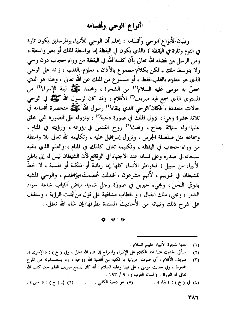 وتبيان لأنواع الوحي وأقسامه: اعلم أن الوحي للأنبياء والمرسلين يكون تارة في النوم وتارة في اليقظة، فالذي يكون في اليقظة إما بواسطة الملك أو بغير واسطة، ومن الرسل من فضله اللَّه تعالى بأن كلمه اللَّه في اليقظة من وراء حجاب دون وحي ولا بتوسط ملك، لكن بكلام مسموع بالآذان، معلوم بالقلب، زائد على الوحي الّذي هو معلوم بالقلب فقط، أو مسموع من الملك عن اللَّه تعالى، وهذا هو الّذي خصّ به موسى عليه السلام [ (1) ] من الشجرة، ومحمد صلّى اللَّه عليه وسلّم ليلة الإسراء [ (2) ] من المستوى الّذي سمع فيه صريف [ (3) ] الأقلام، وقد كان لرسول اللَّه صلّى اللَّه عليه وسلّم في الوحي حالات متعددة، فكان الوحي الّذي يلقاه [ (4) ] رسول اللَّه صلّى اللَّه عليه وسلّم منحصرة أقسامه في ثلاثة عشرة وهي: نزول الملك في صورة دحية [ (5) ] ، ونزوله على الصورة التي خلق عليها وله ستمائة جناح، ونفث [ (6) ] روح القدس في روعه، ورؤيته في المنام، وسماعه مثل صلصلة الجرس، ونزول إسرافيل عليه، وتكليمه اللَّه تعالى بلا واسطة من وراء حجاب في اليقظة، وتكليمه تعالى كذلك في المنام، والعلم الّذي يلقيه سبحانه في صدره وعلى لسانه عند الاجتهاد في الوقائع لأن الشيطان ليس له إلى باطن الأنبياء من سبيل، فخواطر الأنبياء كلها إما ربانية أو ملكية أو نفسية، لا حظّ للشيطان في قلوبهم، لأنهم مشرعون، فلذلك عصمت بواطنهم، والوحي المشبه بدويّ النحل، ومجيء جبريل في صورة رجل شديد بياض الثياب شديد سواد الشعر، ومجيء ملك الجبال، والخطاب مشافهة على قول من يثبت الرؤية، وسنقف على شرح ذلك وتبيانه من الأحاديث المسندة بطرقها إن شاء اللَّه تعالى.