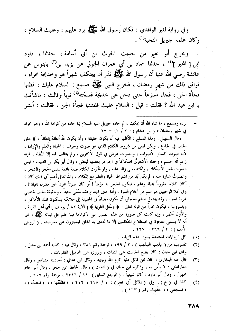 وقال السهيليّ: وهذا التسليم: الأظهر فيه أن يكون حقيقة، وأن يكون اللَّه أنطقه إنطاقا، كما خلق الحنين في الجذع، ولكن ليس من شروط الكلام الّذي هو صوت وحرف: الحياة والعلم والإرادة، لأنه صوت كسائر الأصوات، والصوت عرض في قول الأكثرين، ولم يخالف فيه إلا النّظام، فإنه زعم أنه جسم، وجعله الأشعريّ اصكاكا في الجواهر بعضها لبعض، وقال أبو بكر بن الطيب: ليس الصوت نفس الأصكاك، ولكنه معنى زائد عليه، ولو قدّرت الكلام صفة قائمة بنفس الحجر والشجر، والصوت عبارة عنه، لم يكن بد من اشتراط الحياة والعلم مع الكلام، واللَّه تعالى أعلم أي ذلك كان، أكان كلاما مقرونا بحياة وعلم، فيكون الحجر به مؤمنا؟ أو كان صوتا مجردا غير مقترن بحياة؟، وفي كلا الوجهين هو علم من أعلام النبوة. وأما حنين الجذع فقد سمّي حنينا، وحقيقة الحنين تقتضي شرط الحياة، وقد يحتمل تسليم الحجارة أن يكون مضافا في الحقيقة إلى ملائكة يسكنون تلك الأماكن، ويغمرونها، فيكون مجازا من قوله تعالى: وَسْئَلِ الْقَرْيَةَ [الآية 82/ يوسف] أي أهل القرية، والأول أظهر، وإن كانت كل صورة من هذه الصور التي ذكرناها فيها علم على نبوته صلّى اللَّه عليه وسلّم، غير أنه لا يسمى معجزة في اصطلاح المتكلمين إلا ما تحدى به الخلق فيعجزون عن معارضته. (الروض الأنف) : 2/ 266- 267.