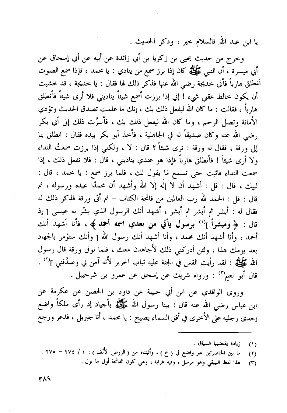وخرج من حديث يحيى بن زكريا بن أبي زائدة عن أبيه عن أبي إسحاق عن أبي ميسرة، أن النبي صلّى اللَّه عليه وسلّم كان إذا برز سمع من ينادي: يا محمد، فإذا سمع الصوت انطلق هاربا فأتى خديجة رضي اللَّه عنها فذكر ذلك لها فقال: يا خديجة، قد خشيت أن يكون خالط عقلي شيء! إني إذا برزت أسمع شيئا يناديني فلا أرى شيئا فأنطلق هاربا، فقالت: ما كان اللَّه ليفعل ذلك بك، إنك ما علمت تصدق الحديث وتؤدي الأمانة وتصل الرحم، وما كان اللَّه ليفعل ذلك بك، فأسرّت ذلك إلى أبي بكر رضي اللَّه عنه وكان صديقا له في الجاهلية، فأخذ أبو بكر بيده فقال: انطلق بنا إلى ورقة، فقال له ورقة: ترى شيئا؟ قال: لا، ولكني إذا برزت سمعت النداء ولا أرى شيئا! فأنطلق هاربا فإذا هو عندي يناديني، قال: فلا تفعل ذلك، إذا سمعت النداء فاثبت حتى تسمع ما يقول لك، فلما برز سمع: يا محمد، قال: