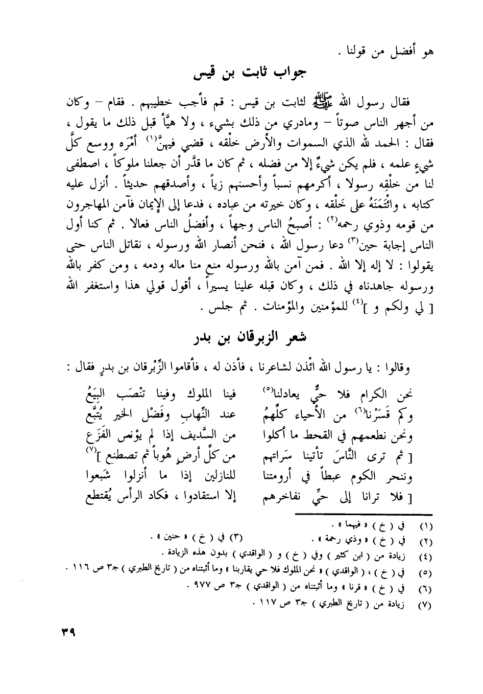 وقالوا: يا رسول اللَّه ائذن لشاعرنا، فأذن له، فأقاموا الزّبرقان بن بدر فقال: