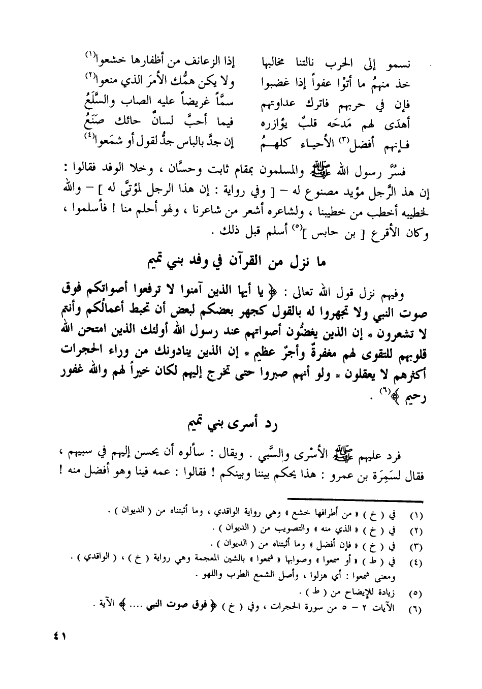 إن هذا الرّجل مؤيد مصنوع له-[وفي رواية: إن هذا الرجل لمؤتّى له]- واللَّه لخطيبه أخطب من خطيبنا، ولشاعره أشعر من شاعرنا، ولهو أحلم منا! فأسلموا، وكان الأقرع [بن حابس] [ (5) ] أسلم قبل ذلك.