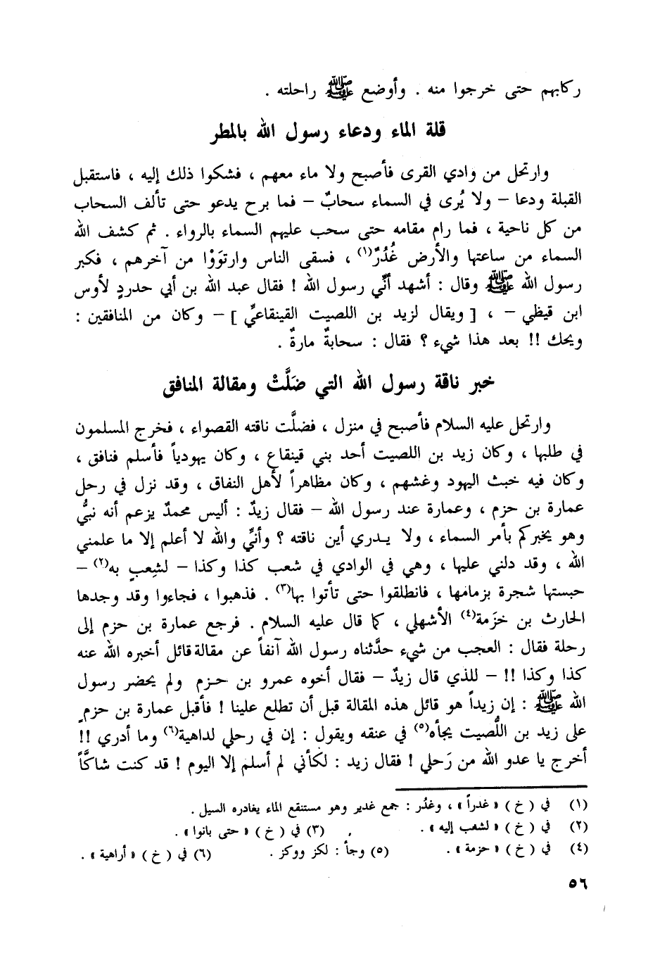 وارتحل من وادي القرى فأصبح ولا ماء معهم، فشكوا ذلك إليه، فاستقبل القبلة ودعا- ولا يرى في السماء سحاب- فما برح يدعو حتى تألف السحاب من كل ناحية، فما رام مقامه حتى سحب عليهم السماء بالرواء. ثم كشف اللَّه السماء من ساعتها والأرض غدر [ (1) ] ، فسقى الناس وارتووا من آخرهم، فكبر رسول اللَّه صلى اللَّه عليه وسلّم وقال: أشهد أنّي رسول اللَّه! فقال عبد اللَّه بن أبي حدرد لأوس ابن قيظي-، [ويقال لزيد بن اللصيت القينقاعيّ]- وكان من المنافقين: