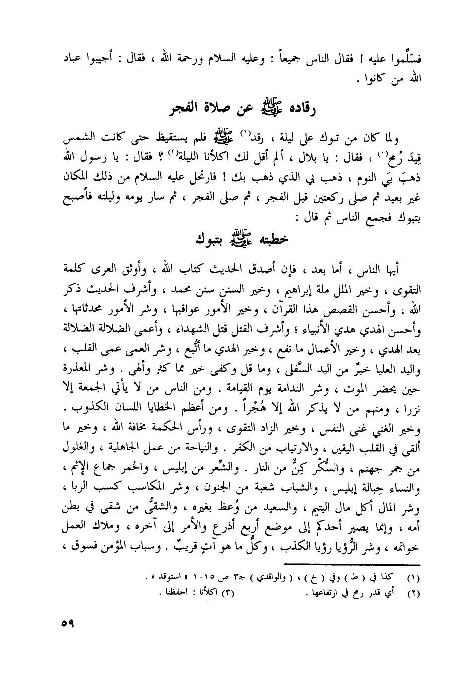 ولما كان من تبوك على ليلة، رقد [ (1) ] صلى اللَّه عليه وسلّم فلم يستقيظ حتى كانت الشمس قيد رمح [ (2) ] ، فقال: يا بلال، ألم أقل لك اكلأنا الليلة [ (3) ] ؟ فقال: يا رسول اللَّه ذهب بي النوم، ذهب بي الّذي ذهب بك! فارتحل عليه السلام من ذلك المكان غير بعيد ثم صلى ركعتين قبل الفجر، ثم صلى الفجر، ثم سار يومه وليلته فأصبح بتبوك فجمع الناس