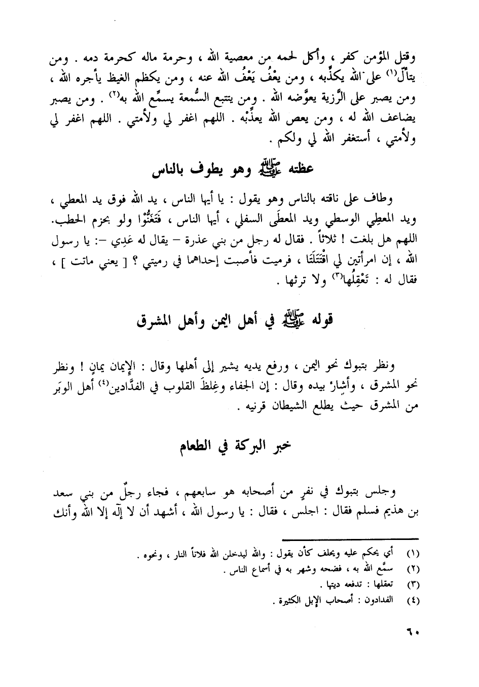 ونظر بتبوك نحو اليمن، ورفع يديه يشير إلى أهلها وقال: الإيمان يمان! ونظر نحو المشرق، وأشار بيده وقال: إن الجفاء وغلظ القلوب في الفدّادين [ (4) ] أهل الوبر من المشرق حيث يطلع الشيطان قرنيه.