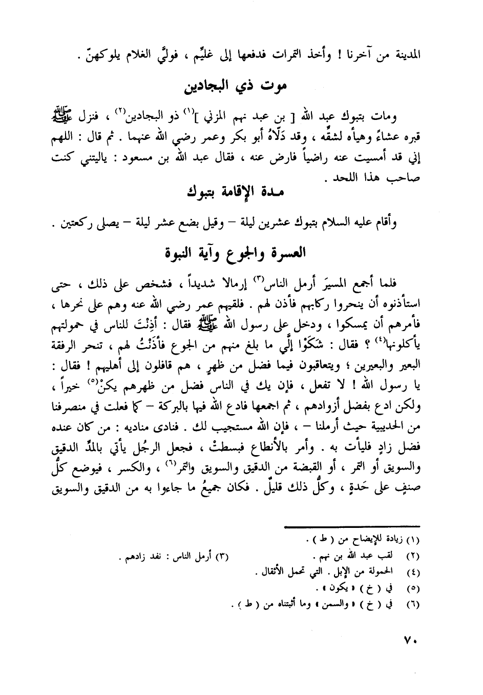 ومات بتبوك عبد اللَّه [بن عبد نهم المزني] [ (1) ] ذو البجادين [ (2) ] ، فنزل صلّى اللَّه عليه وسلّم قبره عشاء وهيأه لشقّه، وقد دلّاه أبو بكر وعمر رضي اللَّه عنهما. ثم قال: اللَّهمّ إني قد أمسيت عنه راضيا فارض عنه،