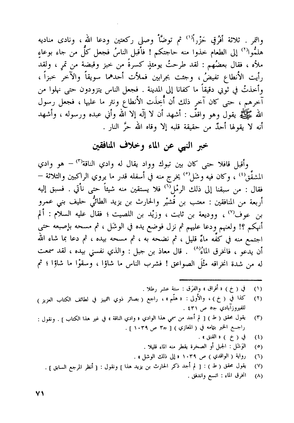 وأقبل قافلا حتى كان بين تبوك وواد يقال له وادي الناقة [ (3) ]- هو وادي المشقّق [ (4) ] ، وكان فيه وشل [ (5) ] يخرج منه في أسفله قدر ما يروي الراكبين والثلاثة- فقال: من سبقنا إلى ذلك الرمل [ (6) ] فلا يستقين منه شيئا حتى نأتي. فسبق إليه أربعة من المنافقين: معتب بن قشير والحارث بن يزيد الطائيّ حليف بني عمرو بن عوف [ (7) ] ، ووديعة بن ثابت، وزيد بن اللصيت، فقال عليه السلام: ألم أنهكم؟! ولعنهم ودعا عليهم ثم نزل فوضع يده في الوشل، ثم مسحه بإصبعه حتى اجتمع منه في كفّه ماء قليل، ثم نضحه به، ثم مسحه بيده، ثم دعا بما شاء اللَّه أن يدعو، فانخرق الماء [ (8) ] .