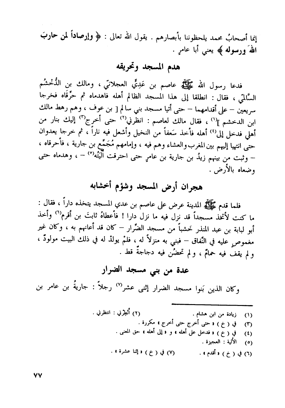 فخرجا سريعين- على أقدامهما- حتى أتيا مسجد بني سالم [بن عوف، وهم رهط مالك ابن الدخشم] [ (1) ] ، فقال مالك لعاصم: انظرني [ (2) ] حتى أخرج [ (3) ] إليك بنار من أهلي فدخل إلى [ (4) ] أهله فأخذ سعفا من النخيل وأشعل فيه نارا، ثم خرجا يعدوان حتى انتهيا إليهم بين المغرب والعشاء وهم فيه، وإمامهم مجمّع بن جارية، فأحرقاه، - وثبت من بينهم زيد بن جارية بن عامر حتى احترقت أليته [ (5) ]-، وهدماه حتى وضعاه بالأرض.