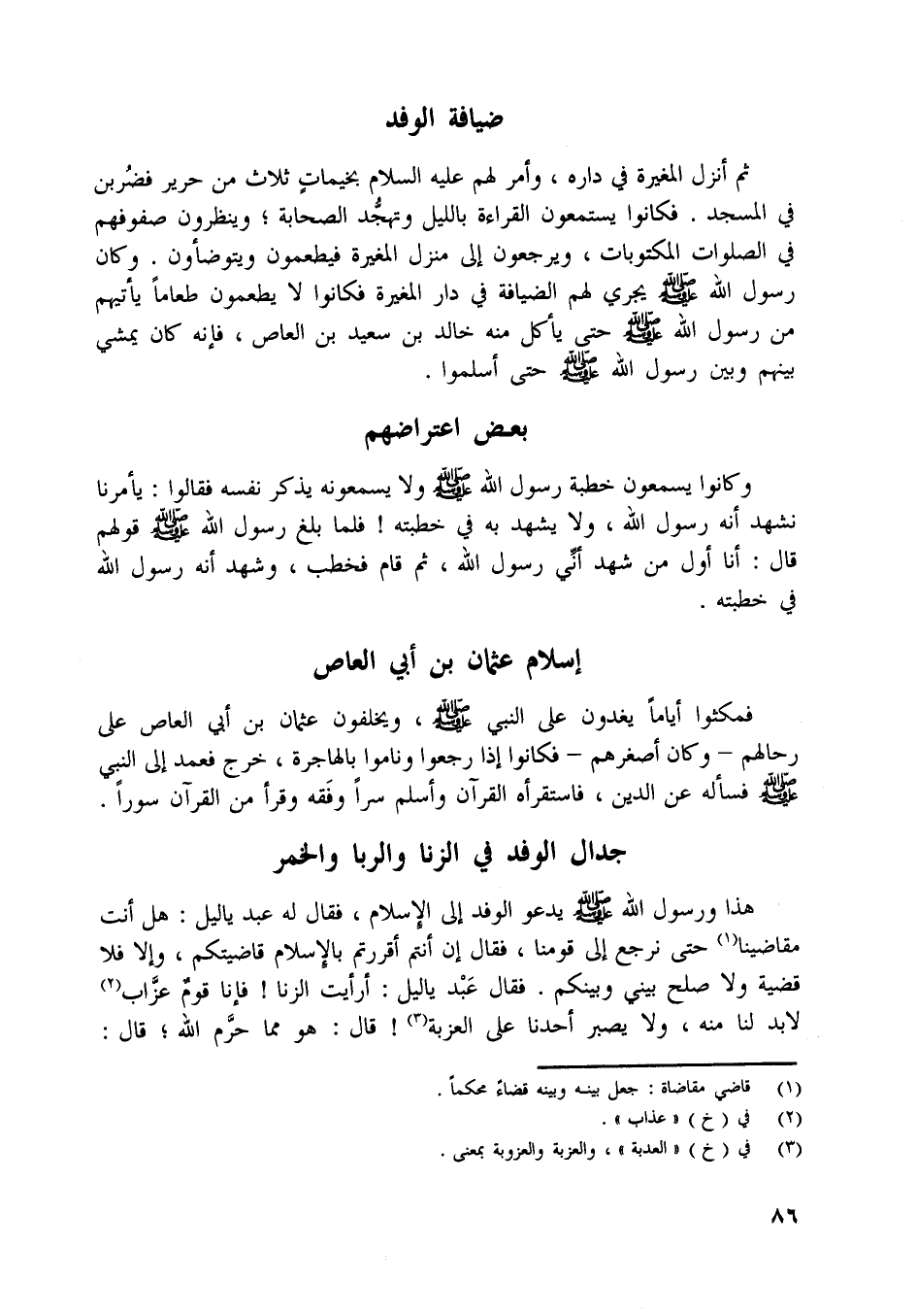 ورسول اللَّه صلّى اللَّه عليه وسلّم يدعو الوفد إلى الإسلام، فقال له عبد ياليل: هل أنت مقاضينا [ (1) ] حتى نرجع إلى قومنا، فقال إن أنتم أقررتم بالإسلام قاضيتكم، وإلا فلا قضية ولا صلح بيني وبينكم. فقال عبد ياليل: أرأيت الزنا! فإنا قوم عزّاب [ (2) ] لا بد لنا منه، ولا يصبر أحدنا على العزبة [ (3) ] ! قال: هو مما حرّم اللَّه، قال: