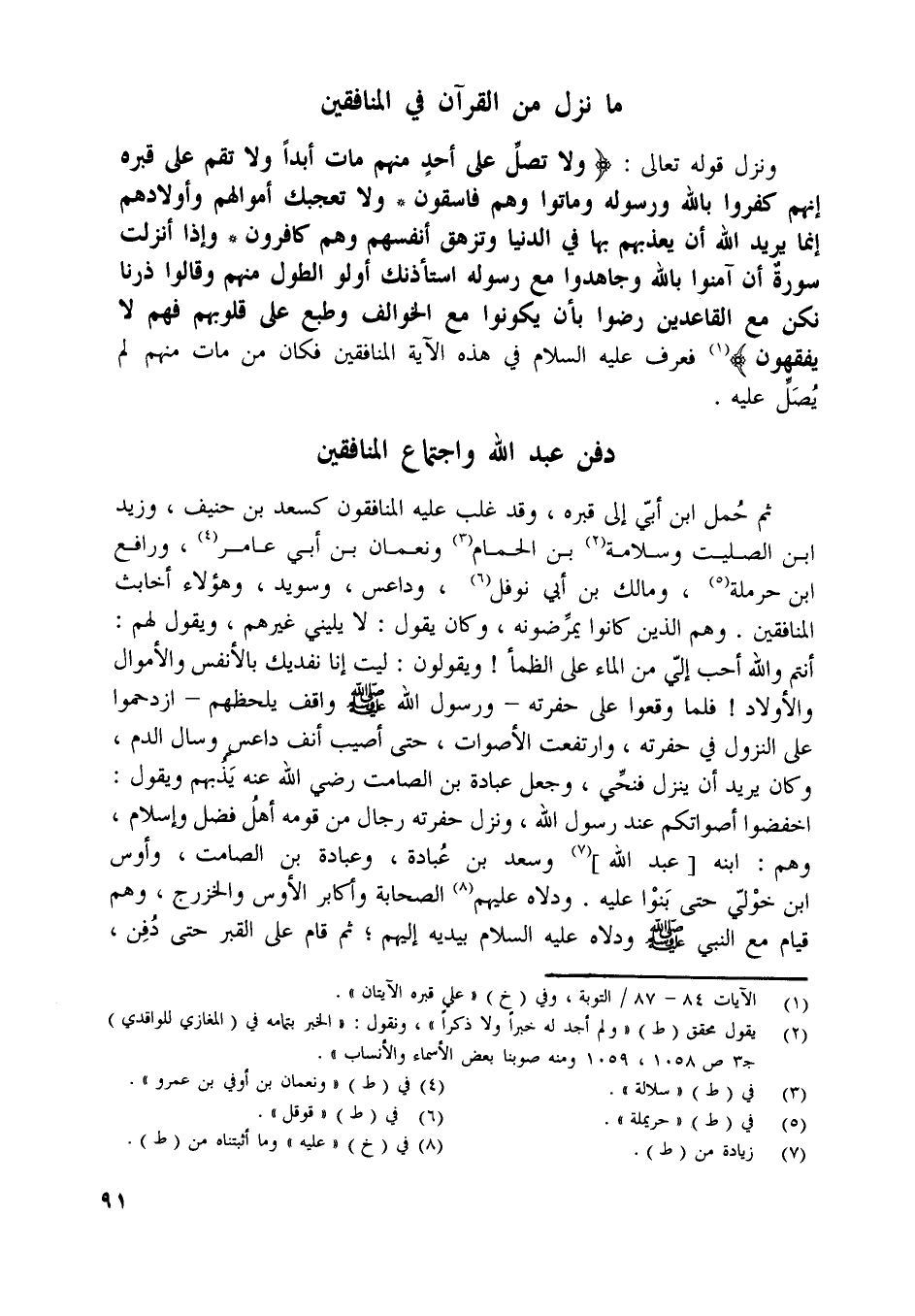 ونزل قوله تعالى: وَلا تُصَلِّ عَلى أَحَدٍ مِنْهُمْ ماتَ أَبَداً وَلا تَقُمْ عَلى قَبْرِهِ إِنَّهُمْ كَفَرُوا بِاللَّهِ وَرَسُولِهِ وَماتُوا وَهُمْ فاسِقُونَ* وَلا تُعْجِبْكَ أَمْوالُهُمْ وَأَوْلادُهُمْ إِنَّما يُرِيدُ اللَّهُ أَنْ يُعَذِّبَهُمْ بِها فِي الدُّنْيا وَتَزْهَقَ أَنْفُسُهُمْ وَهُمْ كافِرُونَ* وَإِذا أُنْزِلَتْ سُورَةٌ أَنْ آمِنُوا بِاللَّهِ وَجاهِدُوا مَعَ رَسُولِهِ اسْتَأْذَنَكَ أُولُوا الطَّوْلِ مِنْهُمْ وَقالُوا ذَرْنا نَكُنْ مَعَ الْقاعِدِينَ* رَضُوا بِأَنْ يَكُونُوا مَعَ الْخَوالِفِ وَطُبِعَ عَلى قُلُوبِهِمْ فَهُمْ لا يَفْقَهُونَ [ (1) ] فعرف عليه السلام في هذه الآية المنافقين فكان من مات منهم لم يصلّ عليه.