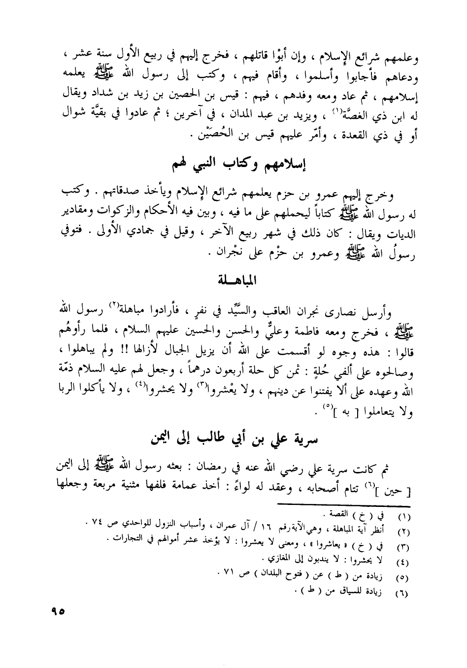 وأرسل نصارى نجران العاقب والسّيّد في نفر، فأرادوا مباهلة [ (2) ] رسول اللَّه صلّى اللَّه عليه وسلّم، فخرج ومعه فاطمة وعليّ والحسن والحسين عليهم السلام، فلما رأوهم قالوا: هذه وجوه لو أقسمت على اللَّه أن يزيل الجبال لأزالها!! ولم يباهلوا، وصالحوه على ألفي حلة: ثمن كل حلة أربعون درهما، وجعل لهم عليه السلام ذمّة اللَّه وعهده على ألا يفتنوا عن دينهم، ولا يعشروا [ (3) ] ولا يحشروا [ (4) ] ، ولا يأكلوا الربا ولا يتعاملوا [به] [ (5) ] .