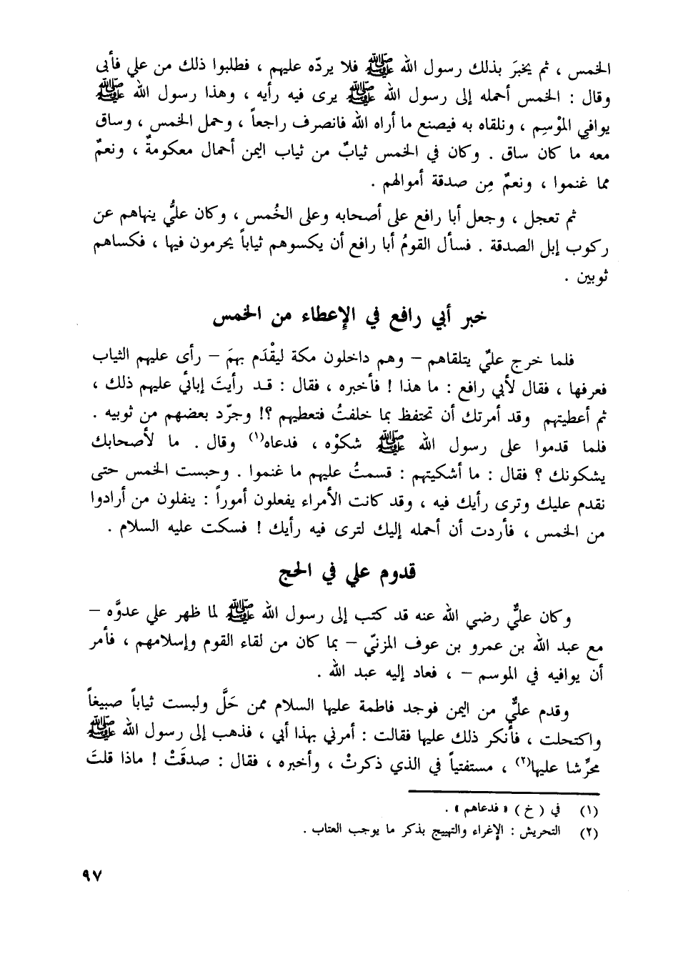 الخمس، ثم يخبر بذلك رسول اللَّه صلّى اللَّه عليه وسلّم فلا يردّه عليهم، فطلبوا ذلك من علي فأبى وقال: الخمس أحمله إلى رسول اللَّه صلّى اللَّه عليه وسلّم يرى فيه رأيه، وهذا رسول اللَّه صلّى اللَّه عليه وسلّم يوافي الموسم، ونلقاه به فيصنع ما أراه اللَّه فانصرف راجعا، وحمل الخمس، وساق معه ما كان ساق.