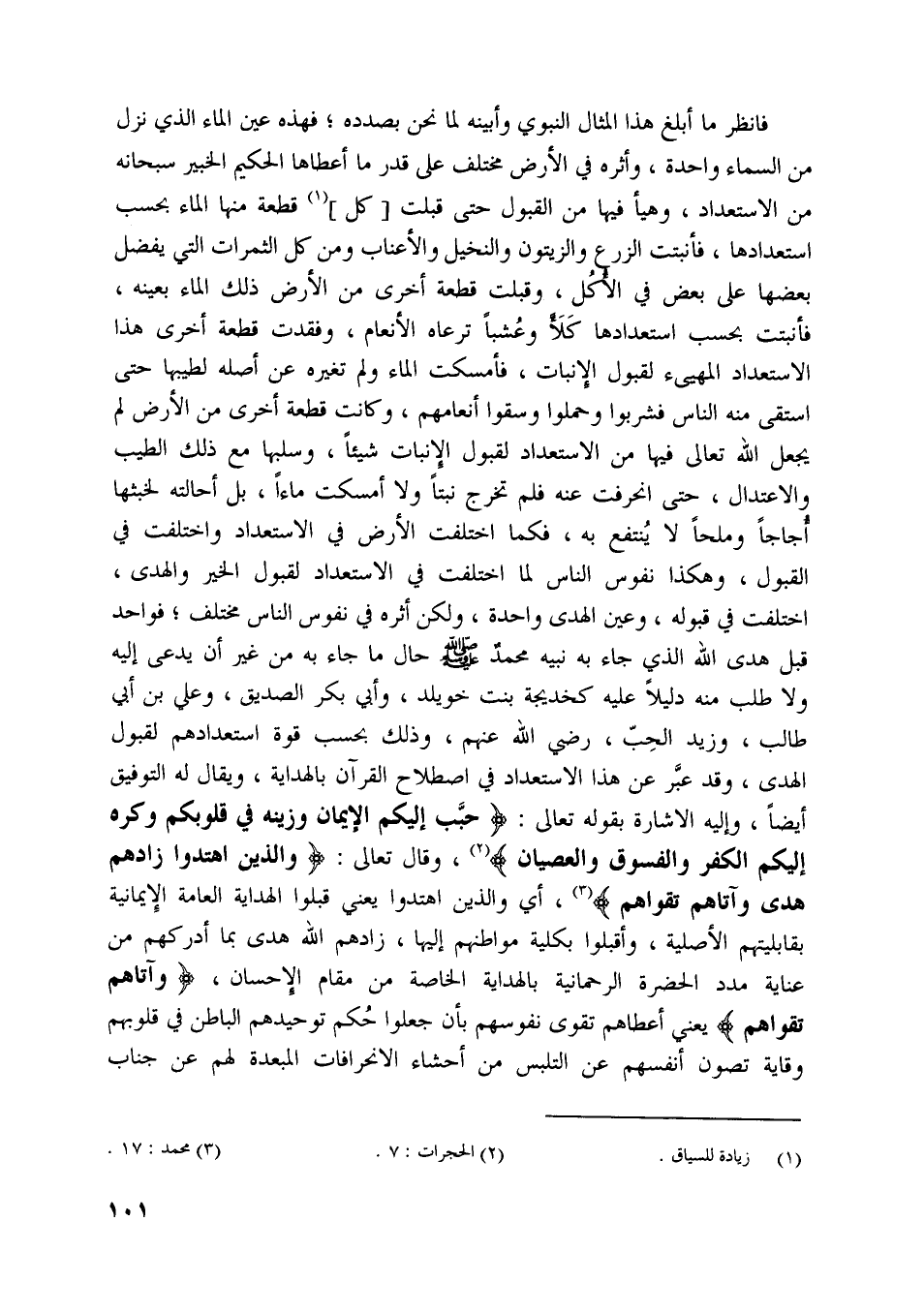 فانظر ما أبلغ هذا المثال النبوي وأبينه لما نحن بصدده، فهذه عين الماء الّذي نزل من السماء واحدة، وأثره في الأرض مختلف على قدر ما أعطاها الحكيم الخبير سبحانه من الاستعداد، وهيأ فيها من القبول حتى قبلت [كل] [ (1) ] قطعة منها الماء بحسب استعدادها، فأنبتت الزرع والزيتون والنخيل والأعناب ومن كل الثمرات التي يفضل بعضها على بعض في الأكل، وقبلت قطعة أخرى من الأرض ذلك الماء بعينه، فأنبتت بحسب استعدادها كلأ وعشبا ترعاه الأنعام، وفقدت قطعة أخرى هذا الاستعداد المهيئ لقبول الإنبات، فأمسكت الماء ولم تغيره عن أصله لطيبها حتى استقى منه الناس فشربوا وحملوا وسقوا أنعامهم، وكانت قطعة أخرى من الأرض لم يجعل اللَّه تعالى فيها من الاستعداد لقبول الإنبات شيئا، وسلبها مع ذلك الطيب والاعتدال، حتى انحرفت عنه فلم تخرج نبتا ولا أمسكت ماء، بل أحالته لخبثها أجاجا وملحا لا ينتفع به، فكما اختلفت الأرض في الاستعداد واختلفت في القبول، وهكذا نفوس الناس لما اختلفت في الاستعداد لقبول الخير والهدى، اختلفت في قبوله، وعين الهدى واحدة، ولكن أثره في نفوس الناس مختلف، فواحد قبل هدى اللَّه الّذي جاء به نبيه محمد صلى اللَّه عليه وسلّم حال ما جاء به من غير أن يدعى إليه ولا طلب منه دليلا عليه كخديجة بنت خويلد، وأبي بكر الصديق، وعلي بن أبي طالب، وزيد الحبّ، رضي اللَّه عنهم، وذلك بحسب قوة استعدادهم لقبول الهدى، وقد عبّر عن هذا الاستعداد في اصطلاح القرآن بالهداية، ويقال له التوفيق أيضا، وإليه الإشارة بقوله تعالى: حَبَّبَ إِلَيْكُمُ الْإِيمانَ وَزَيَّنَهُ فِي قُلُوبِكُمْ وَكَرَّهَ إِلَيْكُمُ الْكُفْرَ وَالْفُسُوقَ وَالْعِصْيانَ [ (2) ] ، وقال تعالى: وَالَّذِينَ اهْتَدَوْا زادَهُمْ هُدىً وَآتاهُمْ تَقْواهُمْ [ (3) ] ، أي والذين اهتدوا يعني قبلوا الهداية العامة الإيمانية بقابليتهم الأصلية، وأقبلوا بكلية مواطنهم إليها، زادهم اللَّه هدى بما أدركهم من عناية مدد الحضرة الرحمانية بالهداية الخاصة من مقام الإحسان، وَآتاهُمْ تَقْواهُمْ يعني أعطاهم تقوى نفوسهم بأن جعلوا حكم توحيدهم الباطن في قلوبهم وقاية تصون أنفسهم عن التلبس من أحشاء الانحرافات المبعدة لهم عن جناب