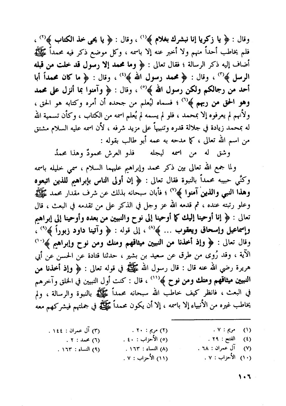 ولما جمع اللَّه تعالى بين ذكر محمد وإبراهيم عليهما السلام، سمي خليله باسمه وكنّي حبيبه محمدا بالنّبوّة فقال تعالى: إِنَّ أَوْلَى النَّاسِ بِإِبْراهِيمَ لَلَّذِينَ اتَّبَعُوهُ وَهذَا النَّبِيُّ وَالَّذِينَ آمَنُوا [ (7) ] ، فأبان سبحانه بذلك عن شرف مقدار محمد صلى اللَّه عليه وسلّم وعلو رتبته عنده، ثم قدمه اللَّه عز وجل في الذكر على من تقدمه في البعث، قال تعالى: إِنَّا أَوْحَيْنا إِلَيْكَ كَما أَوْحَيْنا إِلى نُوحٍ وَالنَّبِيِّينَ مِنْ بَعْدِهِ وَأَوْحَيْنا إِلى إِبْراهِيمَ وَإِسْماعِيلَ وَإِسْحاقَ وَيَعْقُوبَ ... [ (8) ] ، إلى قوله: وَآتَيْنا داوُدَ زَبُوراً [ (9) ] ، وقال تعالى: وَإِذْ أَخَذْنا مِنَ النَّبِيِّينَ مِيثاقَهُمْ وَمِنْكَ وَمِنْ نُوحٍ وَإِبْراهِيمَ [ (10) ] الآية،