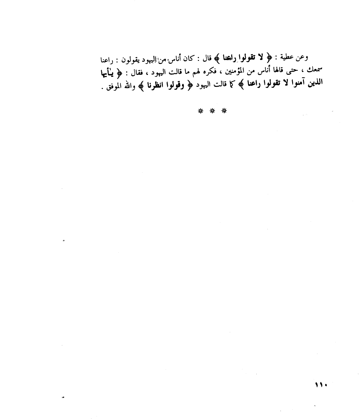 وعن عطية: لا تَقُولُوا راعِنا قال: كان أناس من اليهود يقولون: راعنا سمعك، حتى قالها أناس من المؤمنين، فكره لهم ما قالت اليهود، فقال: يا أَيُّهَا الَّذِينَ آمَنُوا لا تَقُولُوا راعِنا كما قالت اليهود وَقُولُوا انْظُرْنا واللَّه الموفق.